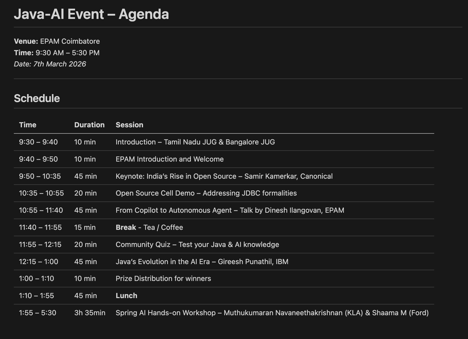 Hosted at EPAM Systems, Coimbatore, this event focuses on practical adoption of AI inside modern Java systems — not theory, not hype, but actual implementation.