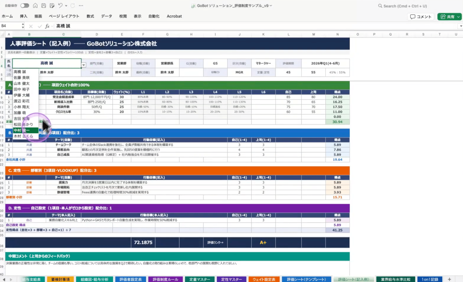 3️⃣ 評価制度Excel自動作成 ── VLOOKUP連動・条件付き書式・グラフ付きの人事評価シートを一発生成