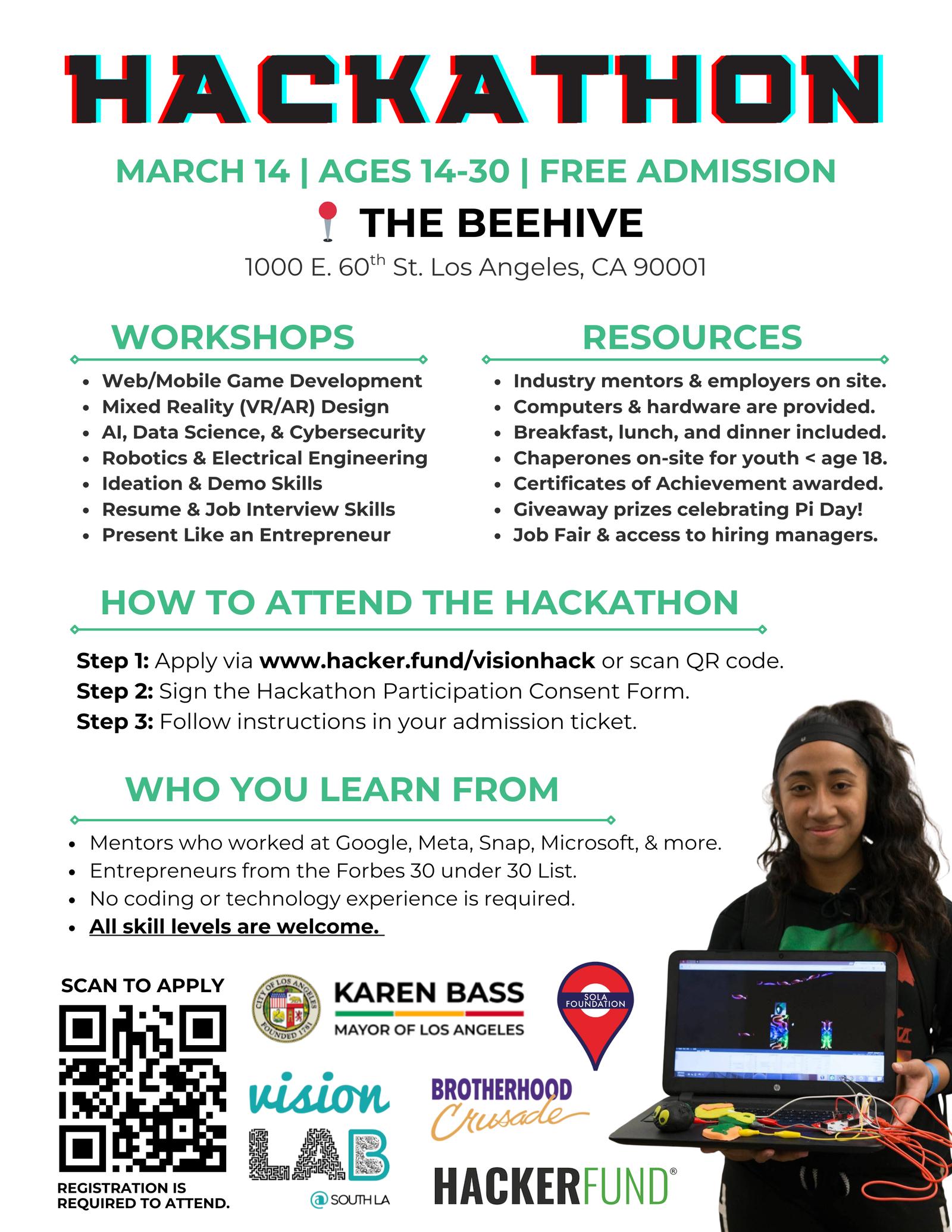 A 12-hour hackathon in South LA on Saturday March 14th, 2026 (aka Pi Day) at the SoLa Tech & Entrepreneurship Center at The Beehive for students ages 14-30.