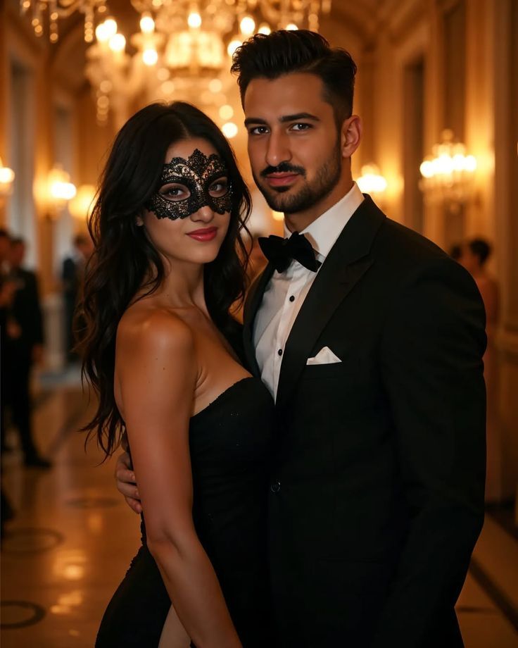 Enter a stunning black-and-gold themed venue where masks and black-tie attire create an atmosphere of elegance and intrigue.