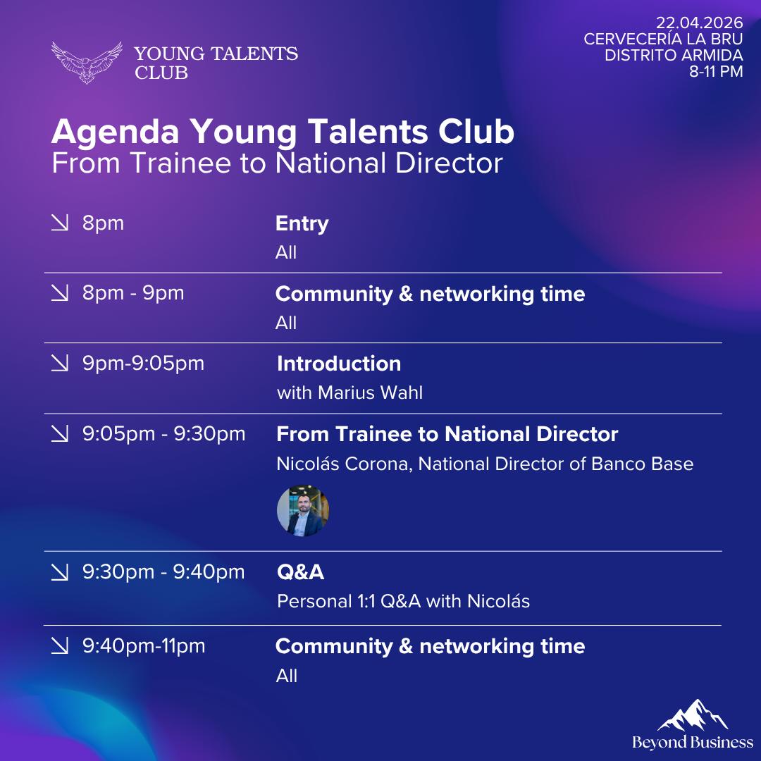 Speaker this time: Nicolás Eguiarte Corona, from Trainee to National Director of one of Mexico's leading banks, Banco Base. Nicolás will share exclusive insights into his daily work, gives international career tips and answers personally your questions.