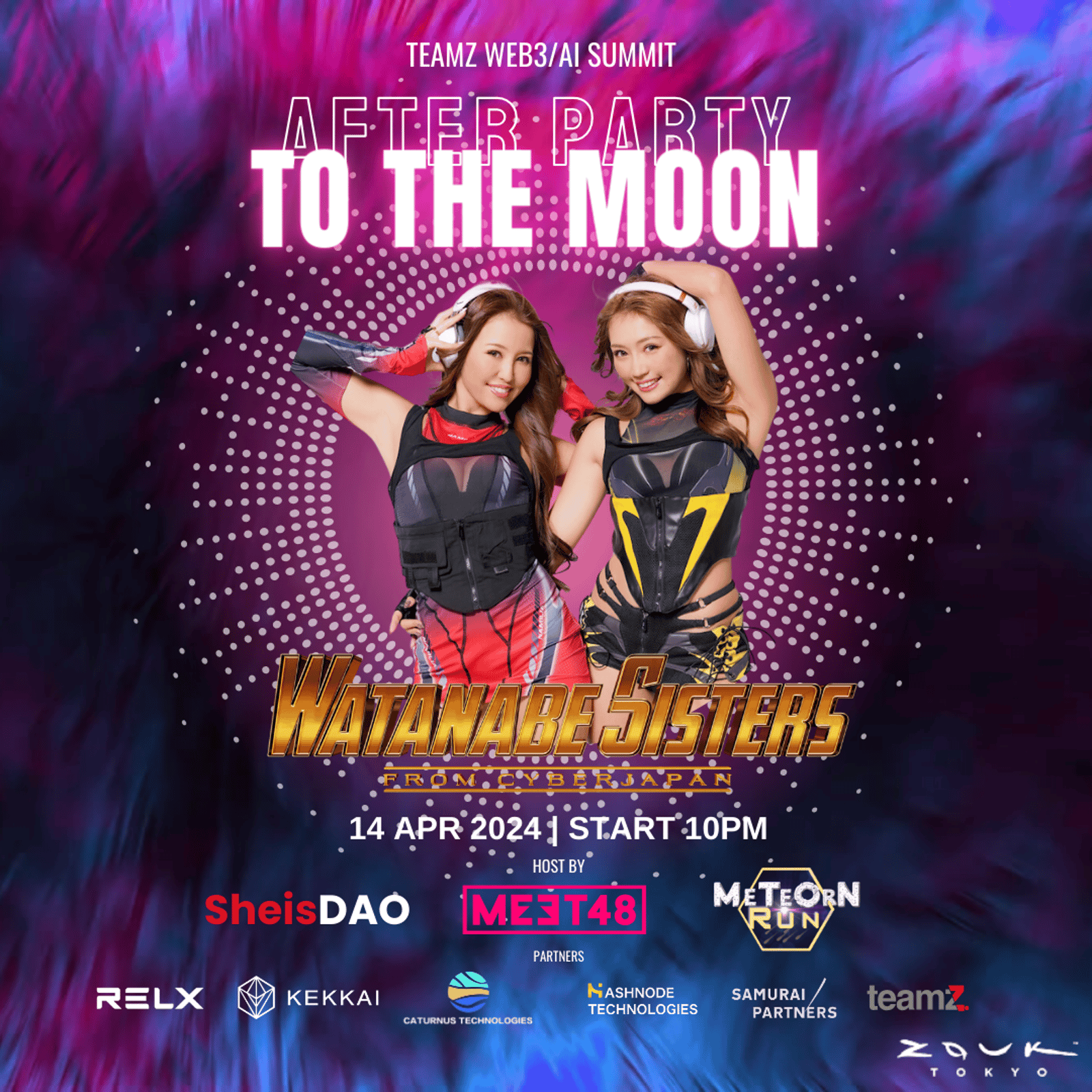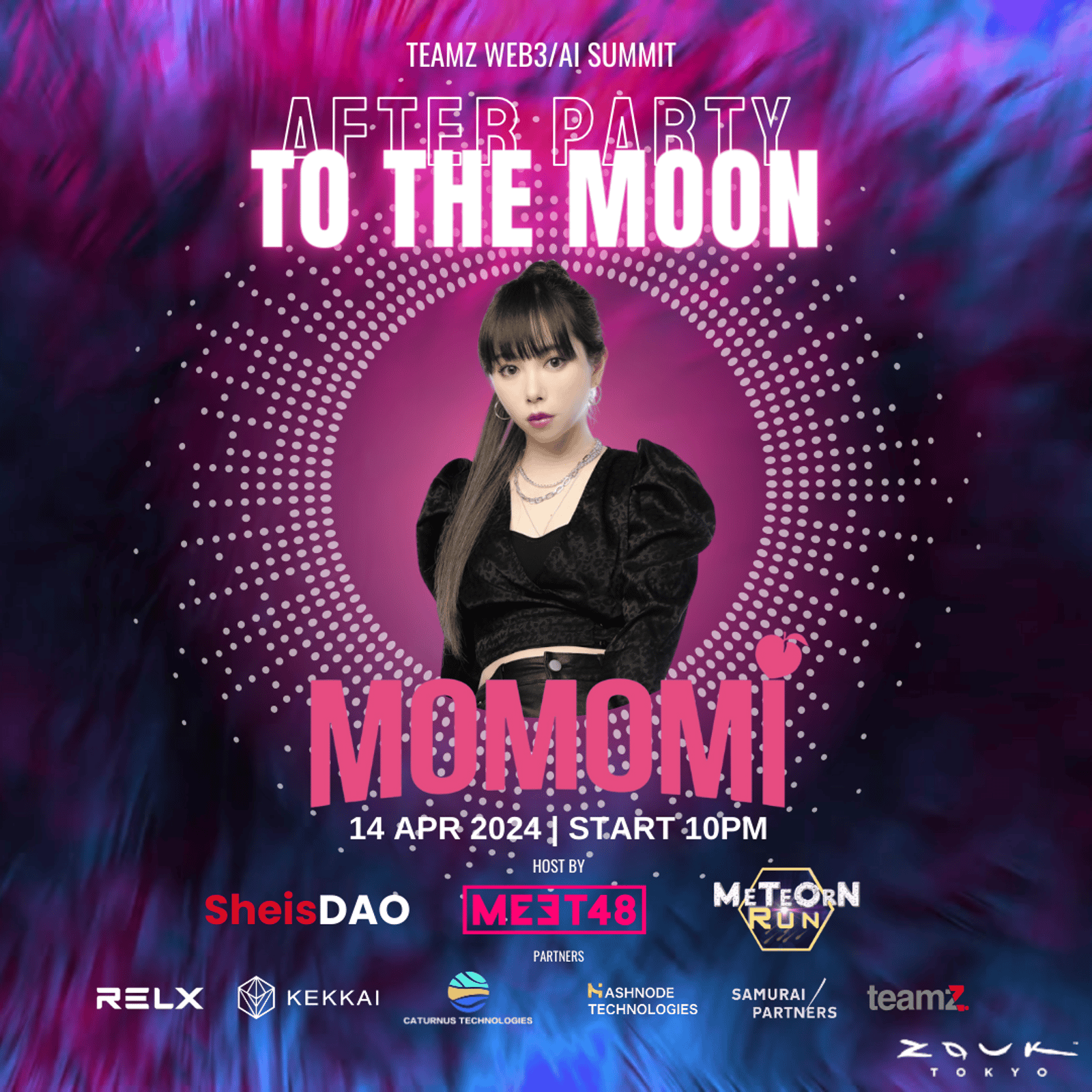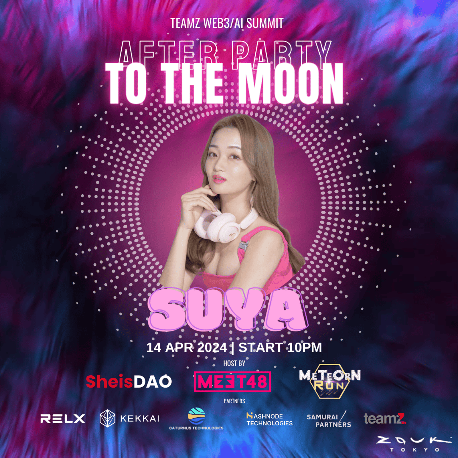 Presenting "To The Moon," the official after party hosted by SheisDAO, Meteorn Run, and Meet48. We extend an exclusive invitation to all VIPs, WEB3.0/AI experts, venture capital partners, startup owners, executives, and friends to partake in this extraordinary night. Joining us will be influencers and renowned DJs/Artists, ensuring a dynamic atmosphere that blends networking, exposure, and celebration.