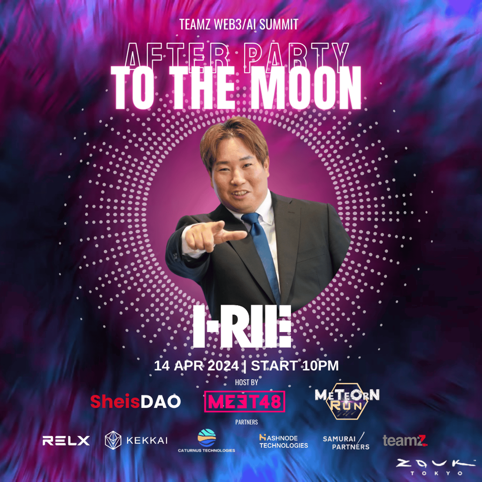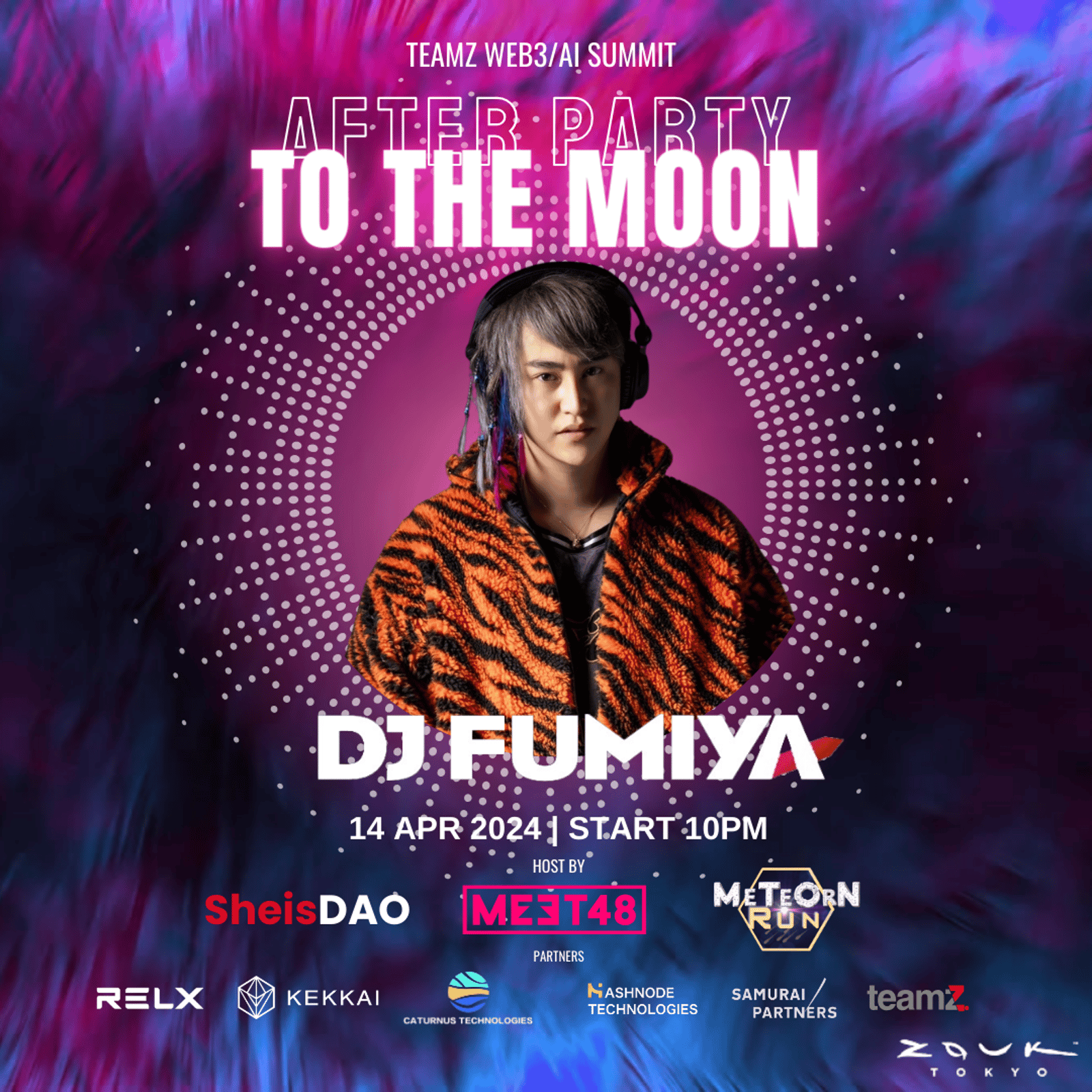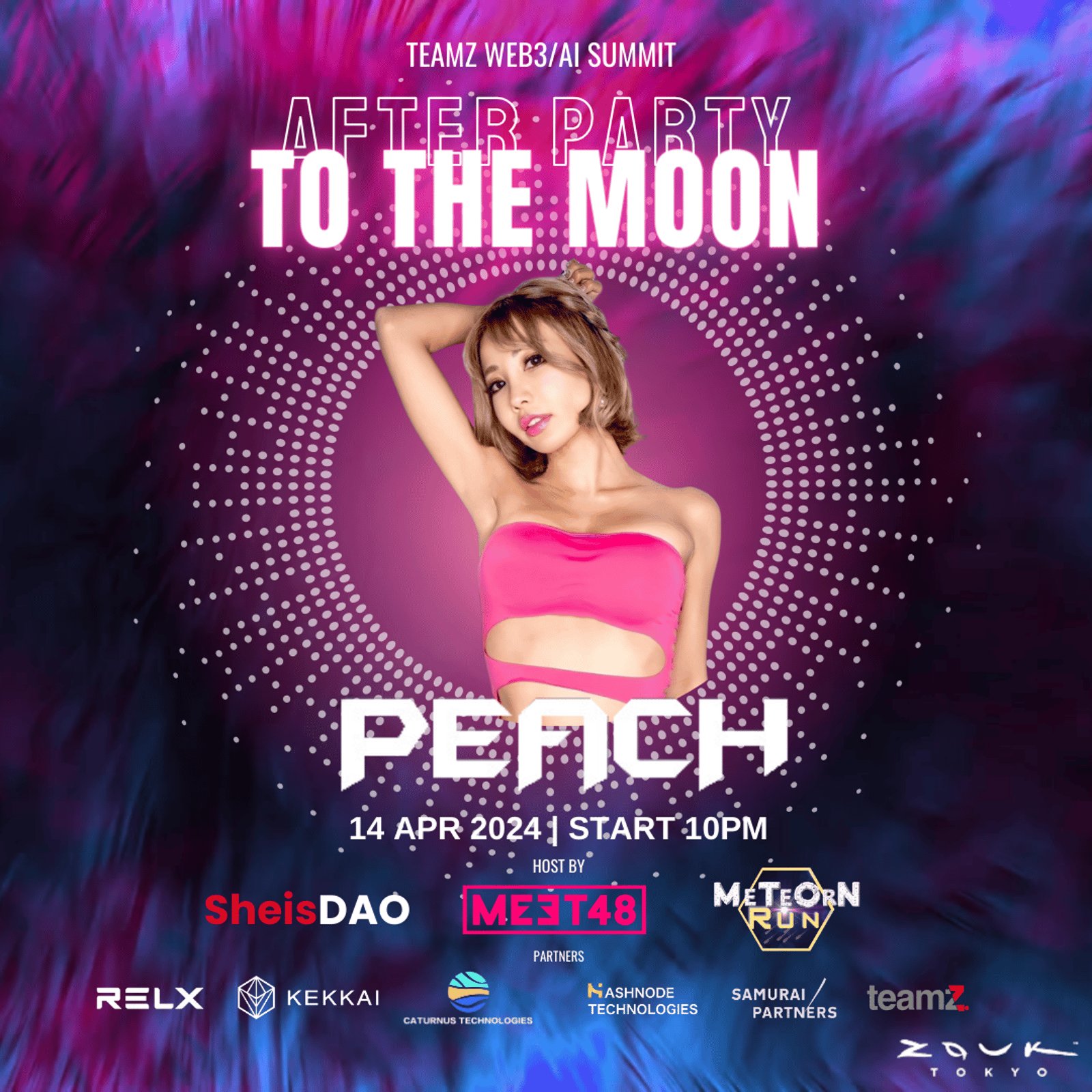 Presenting "To The Moon," the official after party hosted by SheisDAO, Meteorn Run, and Meet48. We extend an exclusive invitation to all VIPs, WEB3.0/AI experts, venture capital partners, startup owners, executives, and friends to partake in this extraordinary night. Joining us will be influencers and renowned DJs/Artists, ensuring a dynamic atmosphere that blends networking, exposure, and celebration.