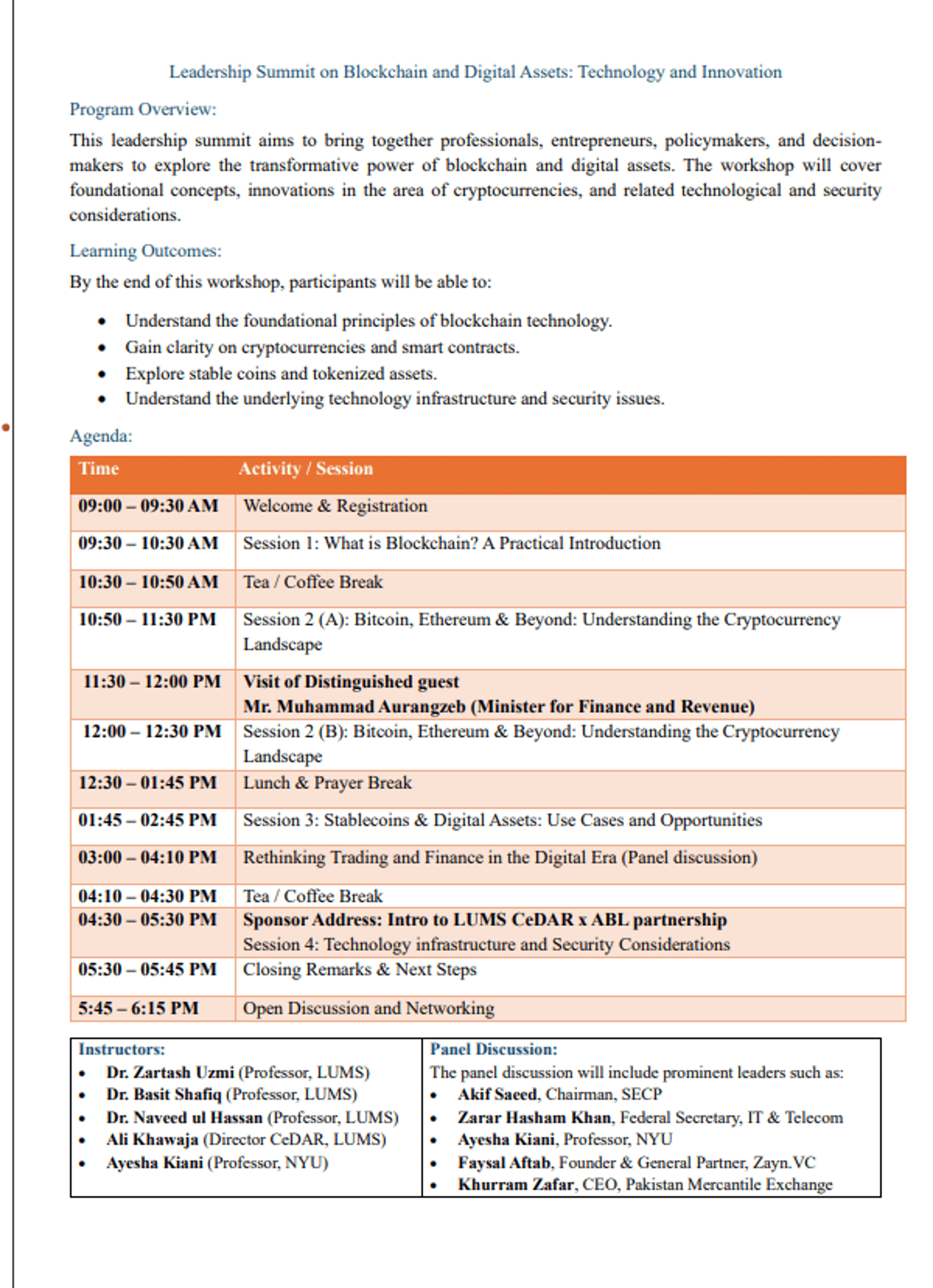 We are pleased to invite you to participate in “A Leadership Summit on Blockchain and Digital Assets: Technology and Innovation,” hosted by the Center for Digital Assets Research (CeDAR) at LUMS on August 23, 2025, at Serena, Islamabad, with the esteemed presence of Guest of Honor, Muhammad Aurangzeb, Finance Minister of Pakistan.