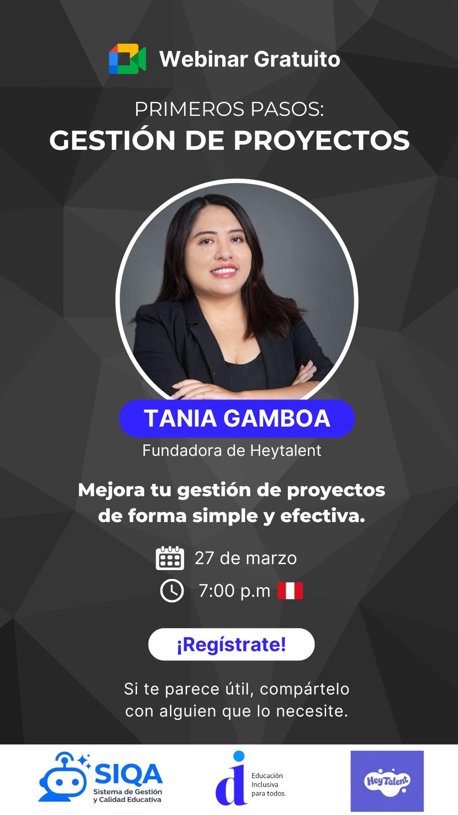 Participa en este webinar gratuito de Gestión de Proyectos junto a Tania Gamboa, Ingeniera Industrial, speaker y fundadora de HeyTalent, con experiencia liderando proyectos end to end con metodologías ágiles, tradicionales e híbridas.