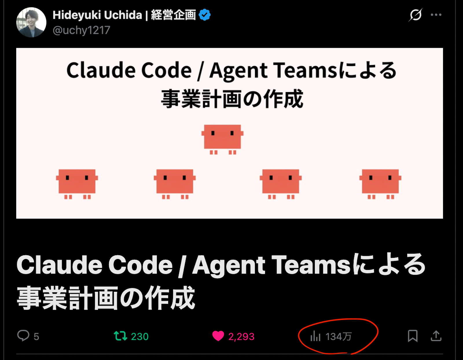 「Claude Code / Agent Teamsによる事業計画の作成」がXで130万再生。