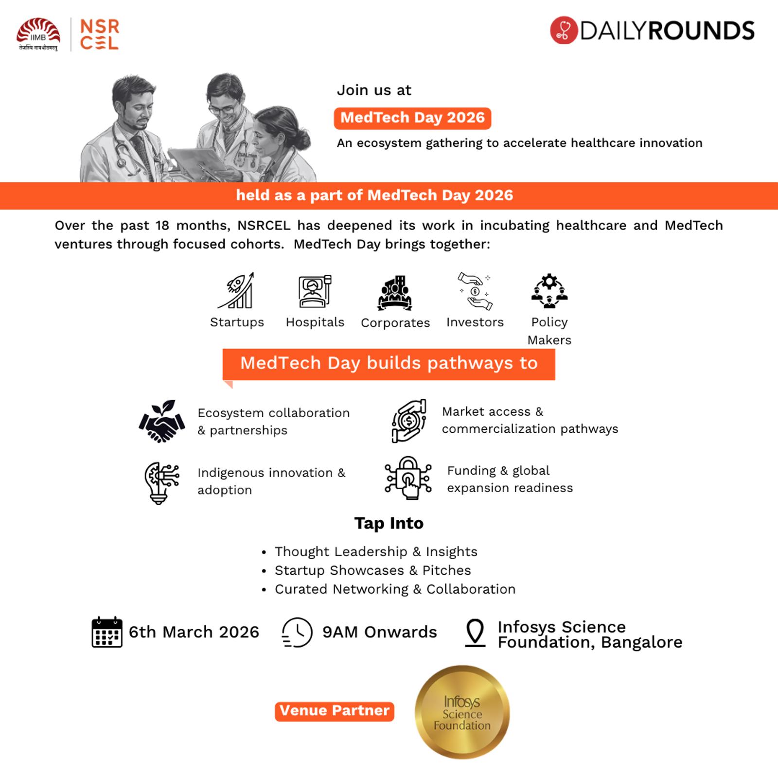 MedTech Day, hosted as part of NSRCEL’s Healthcare Incubation Program in partnership with DailyRounds, brought together innovators, investors, clinicians, and ecosystem leaders in one room to tackle critical challenges in healthcare entrepreneurship - catalyzing meaningful solutions, strategic connections, and a clearer path forward for market-ready healthtech ventures.