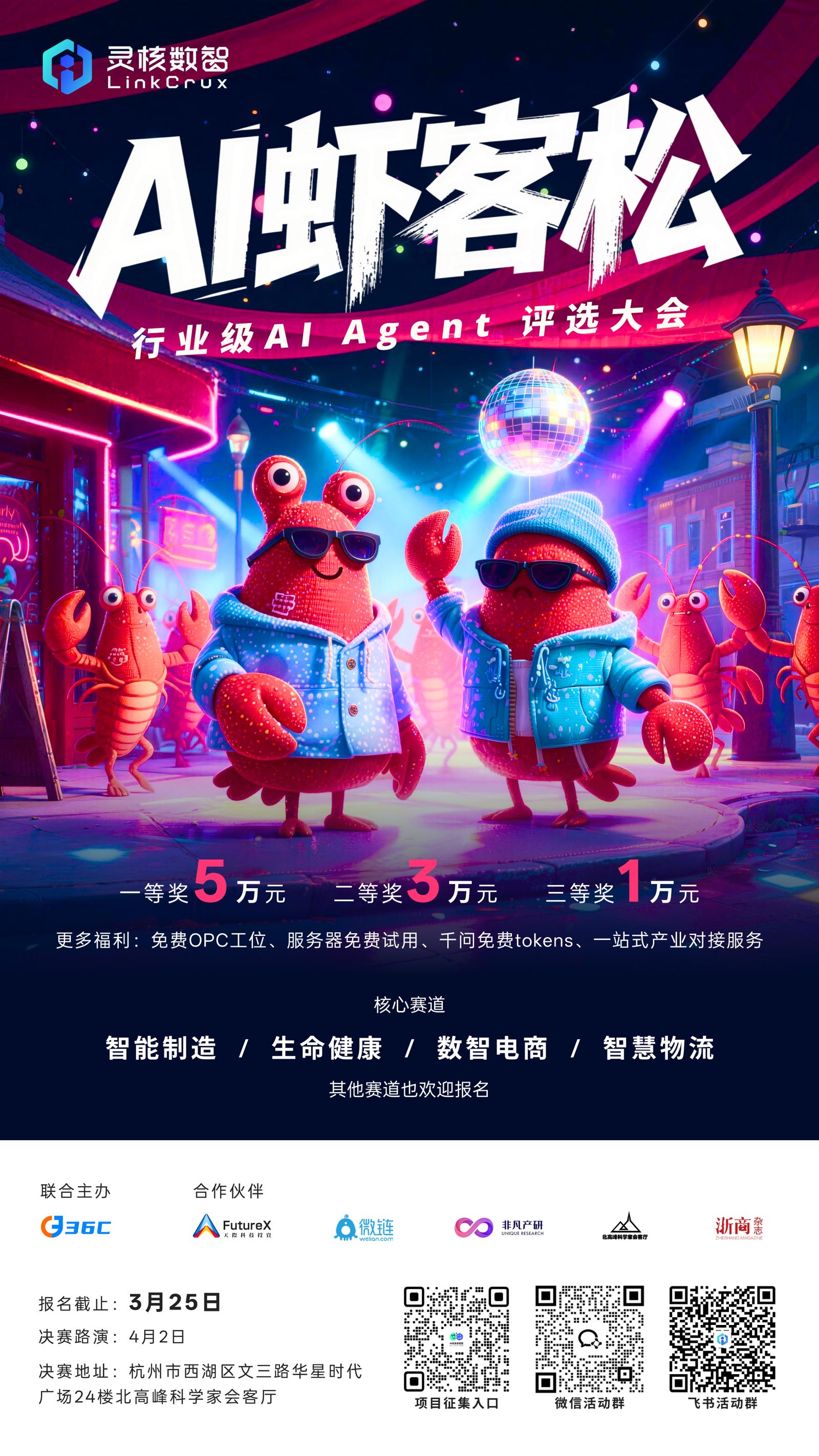 本次活动中,我们将特别邀请大家报名参与 「灵核数智·AI虾客松」——一场面向行业级 AI Agent 的评选大会。赛道覆盖智能制造、生命健康、数智电商、智慧物流等核心领域,总奖金池丰厚,更有 OPC 工位、服务器试用、千问 tokens 等福利加持。