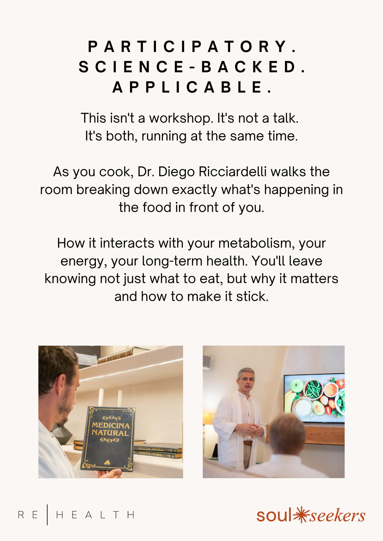 The heart of the experience. As you cook together, Dr. Ricciardelli guides you through the science behind what's in front of you, how to structure your nutrition, how food interacts with your metabolism and energy, and the daily health habits that genuinely compound over time. Participatory, practical, grounded in real medicine.