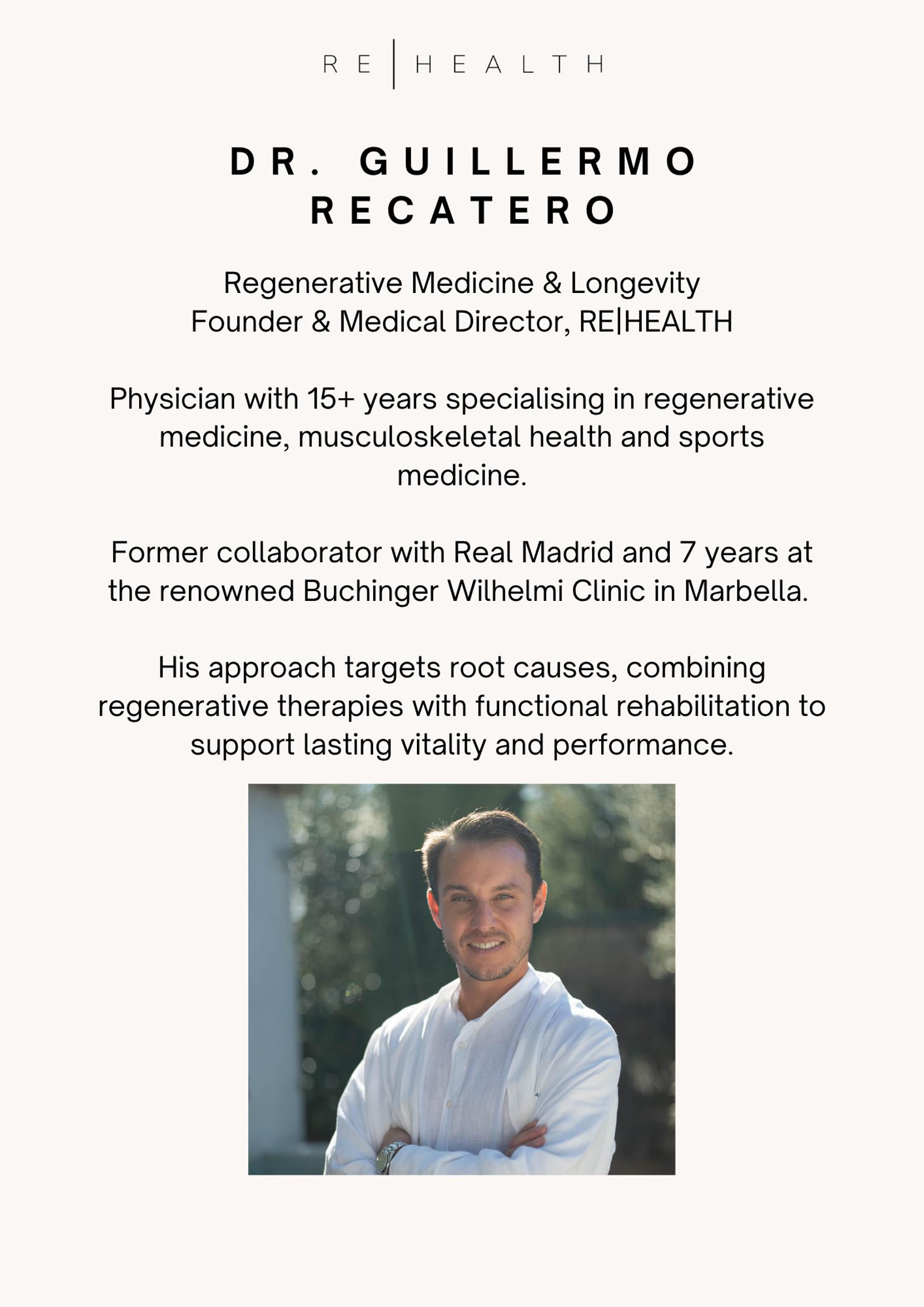 You arrive at the clinic and are welcomed by Dr. Guillermo Recatero himself. A short walk through the space introduces you to the philosophy behind RE|HEALTH, what integrative health really means, and why it changes everything.