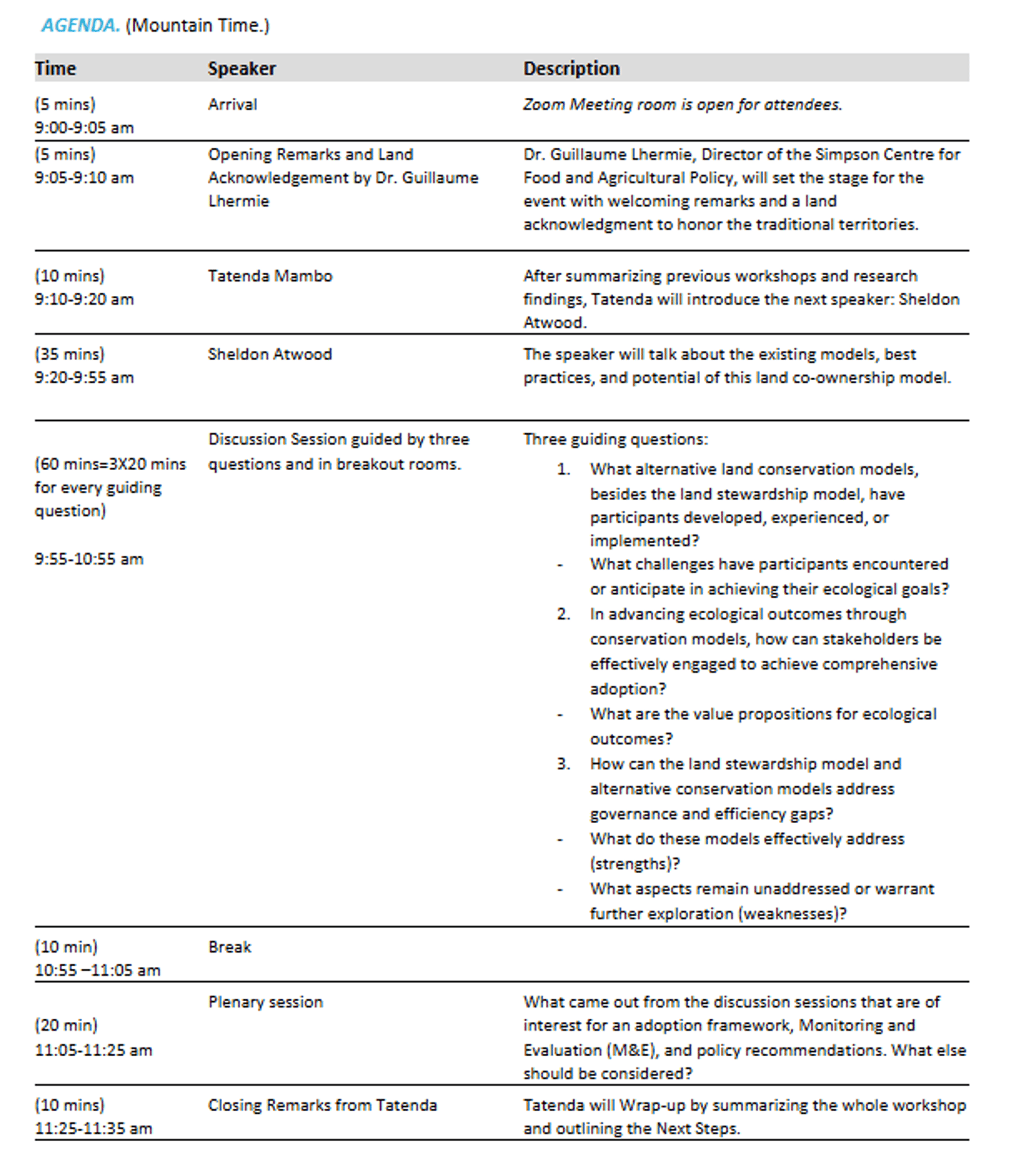 After summarizing recent research and workshop findings, Tatenda will introduce Sheldon Atwood, who will present land co-ownership models, best practices, and opportunities for collaboration in sustainable agriculture. The event will feature discussions on conservation approaches, the Land Stewardship Model, and its implementation in Alberta, with participation from various stakeholders. The session explores ways to build synergy across sectors and foster collaboration for advancing regenerative agriculture, with all discussions adhering to anonymity and confidentiality guidelines. The discussions will revolve around the following questions: