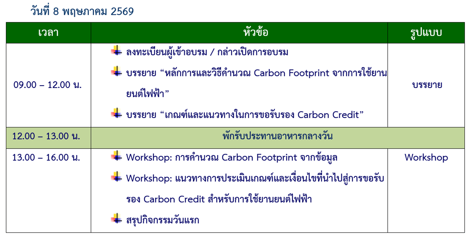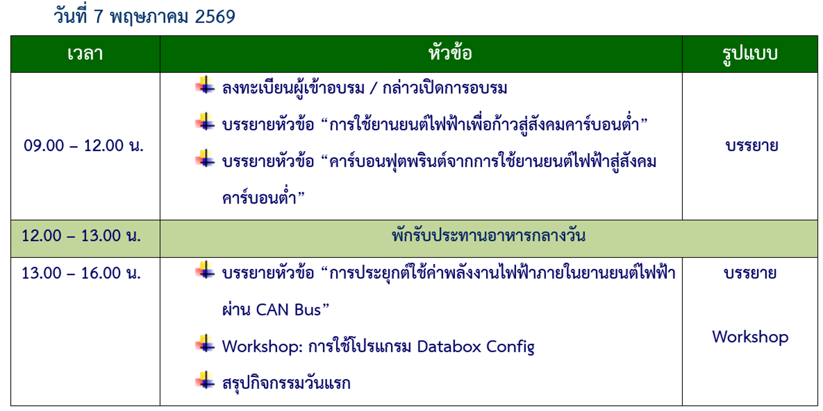 EV-3 : การประเมิน Carbon Footprint จากข้อมูล CAN Bus ภายในยานยนต์ไฟฟ้า สู่การขอรับรอง Carbon Credit(วันที่ 7-8 พฤษภาคม 2569)