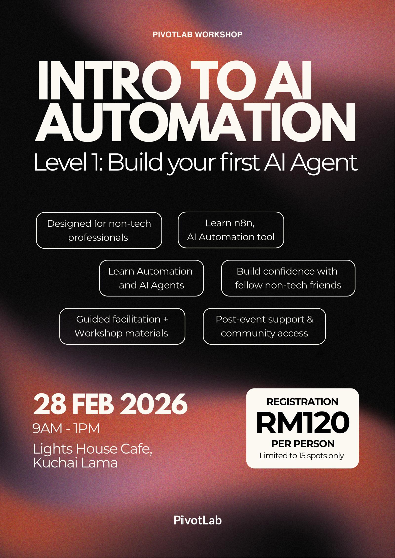 Tickets are RM120 per person, priced intentionally low to keep the workshop accessible. The fee goes directly toward sustaining the PivotLab community and includes a complimentary drink, redeemable at the café on the day of the workshop.