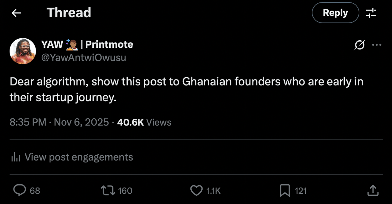 I made a harmless tweet about connecting with Ghanaian founders who are early in their startup journey, and the engagement was through the roof.