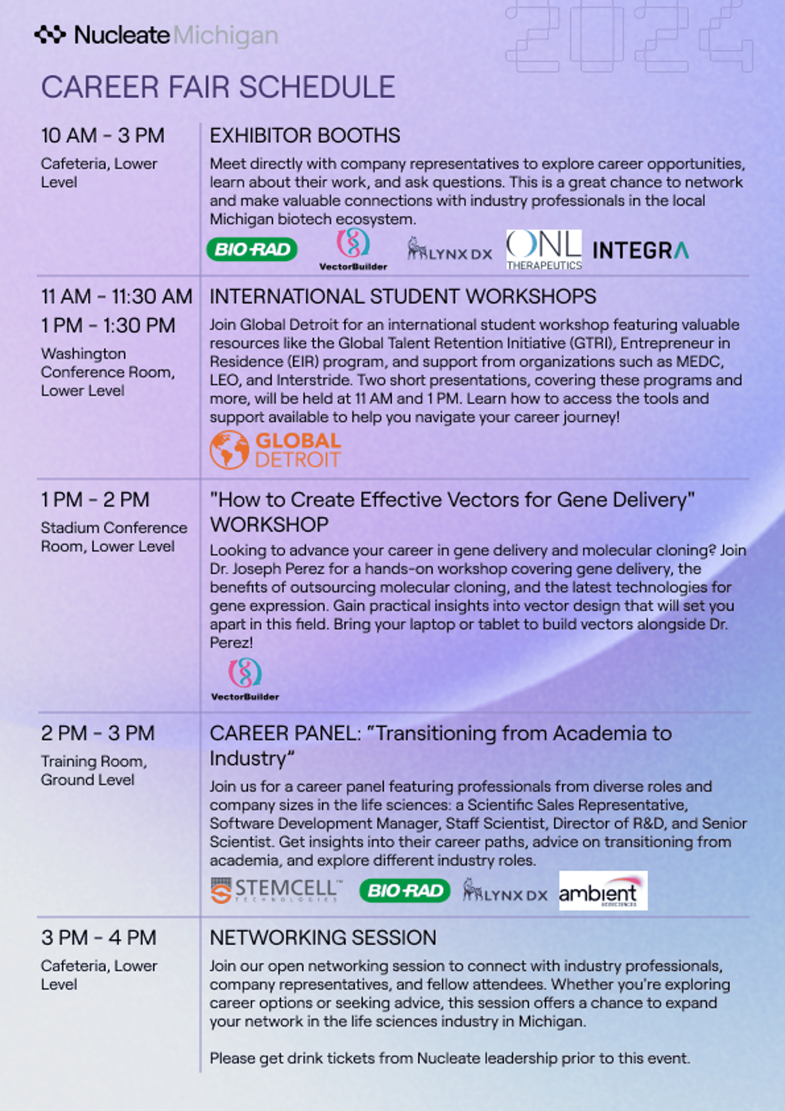 The Michigan Life Sciences Career Fair is designed to foster meaningful interactions, provide learning opportunities, and facilitate networking for attendees and participating companies. We warmly welcome academic trainees, including PhD students, postdoctoral researchers, master’s students, and undergraduate students. This event is an excellent platform to advance your career in the life sciences field.