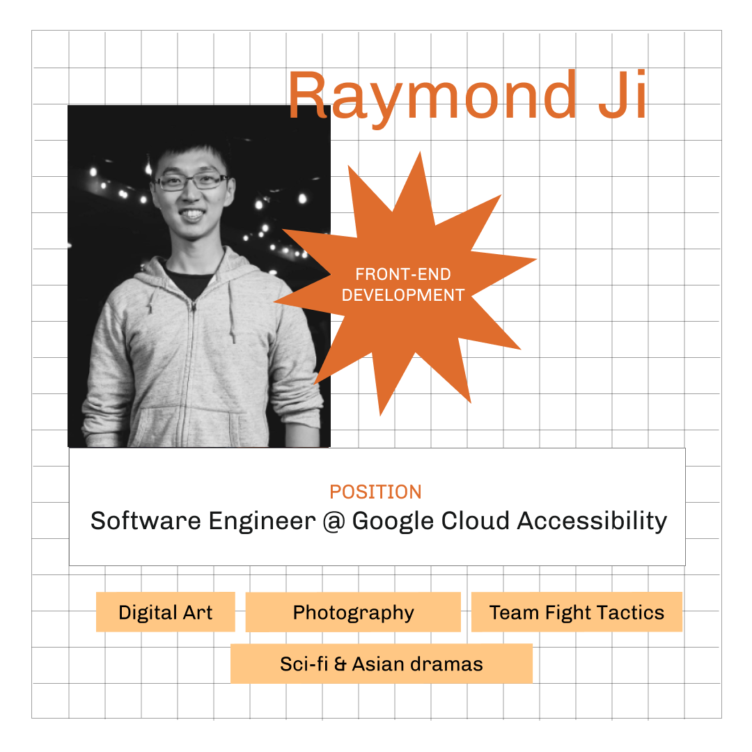 Raymond is an SWE working at Google Cloud Accessibility who dabbles in UI and digital art. Raymond is also interested in photography, team fight tactics, and sci-fi and Asian dramas.