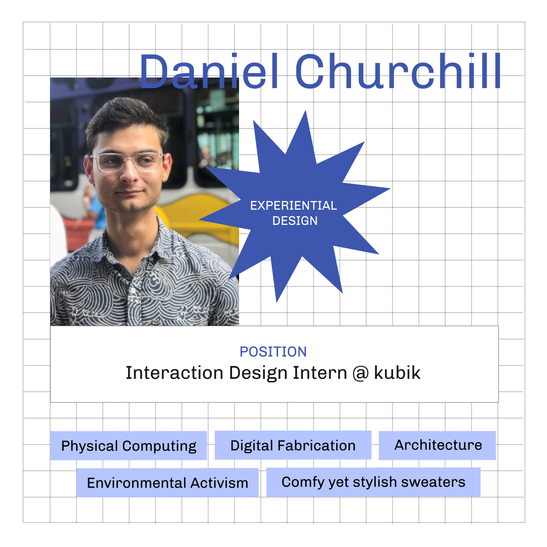Daniel is a 4th-year Interaction Design student who is interning at kubik. He’s fond of visiting art exhibits, messing with Arduino, and rocking comfy sweaters.