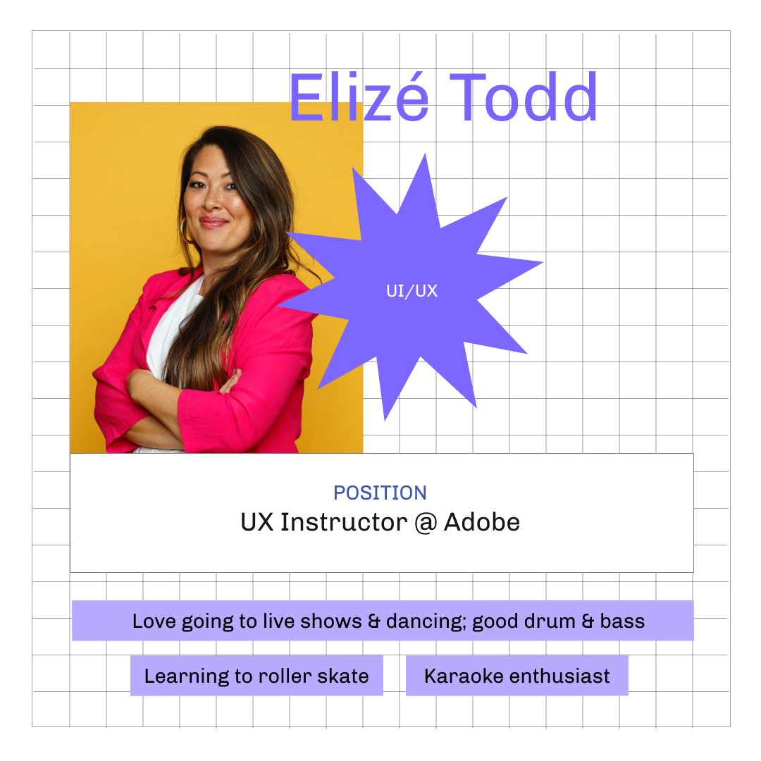 Elizé is an enterprise instructor for Adobe XD and runs her own UX consultancy. She's known for making UX education fun and exciting through her speaking engagements and content on Youtube and Instagram. You can find her at @elize_UX.