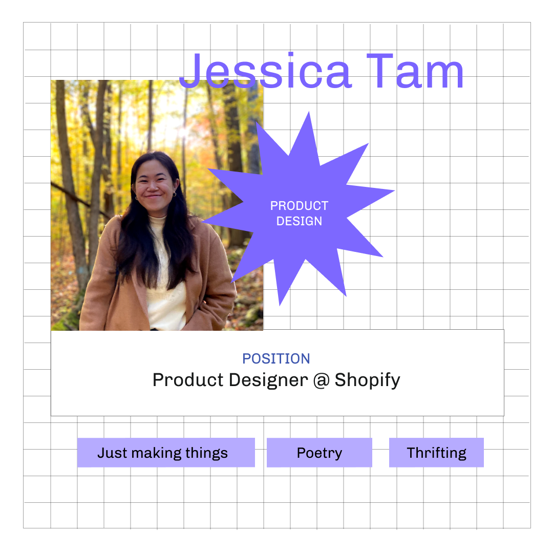 Jessica Tam is a product designer at Shopify working on the platform team focusing on making partners successful. She is a self-taught designer with a background in Legal Studies and prior to design worked in marketing. In her spare time, she runs a shop online selling stickers and illustrations called Ugly Cute Life.