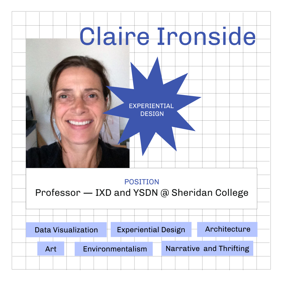 Claire is a professor at Sheridan College specializing in experiential design, data visualization, 3D design, environmentalism, and narrative design! She's also really interested in thrifting.