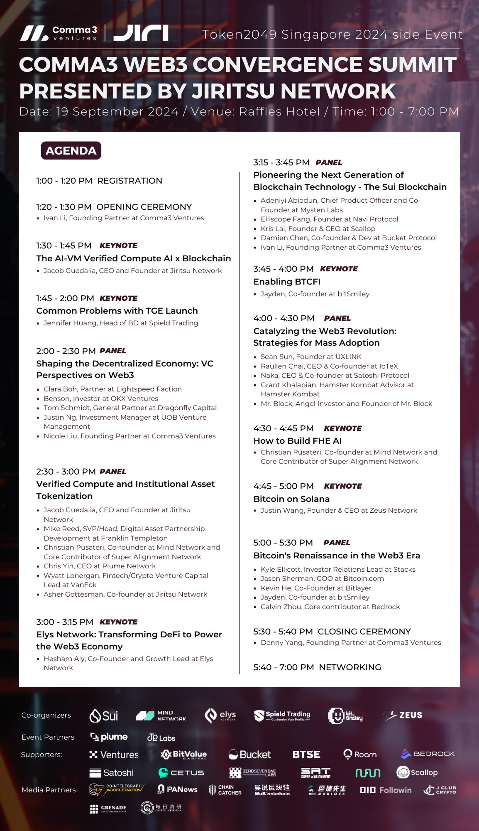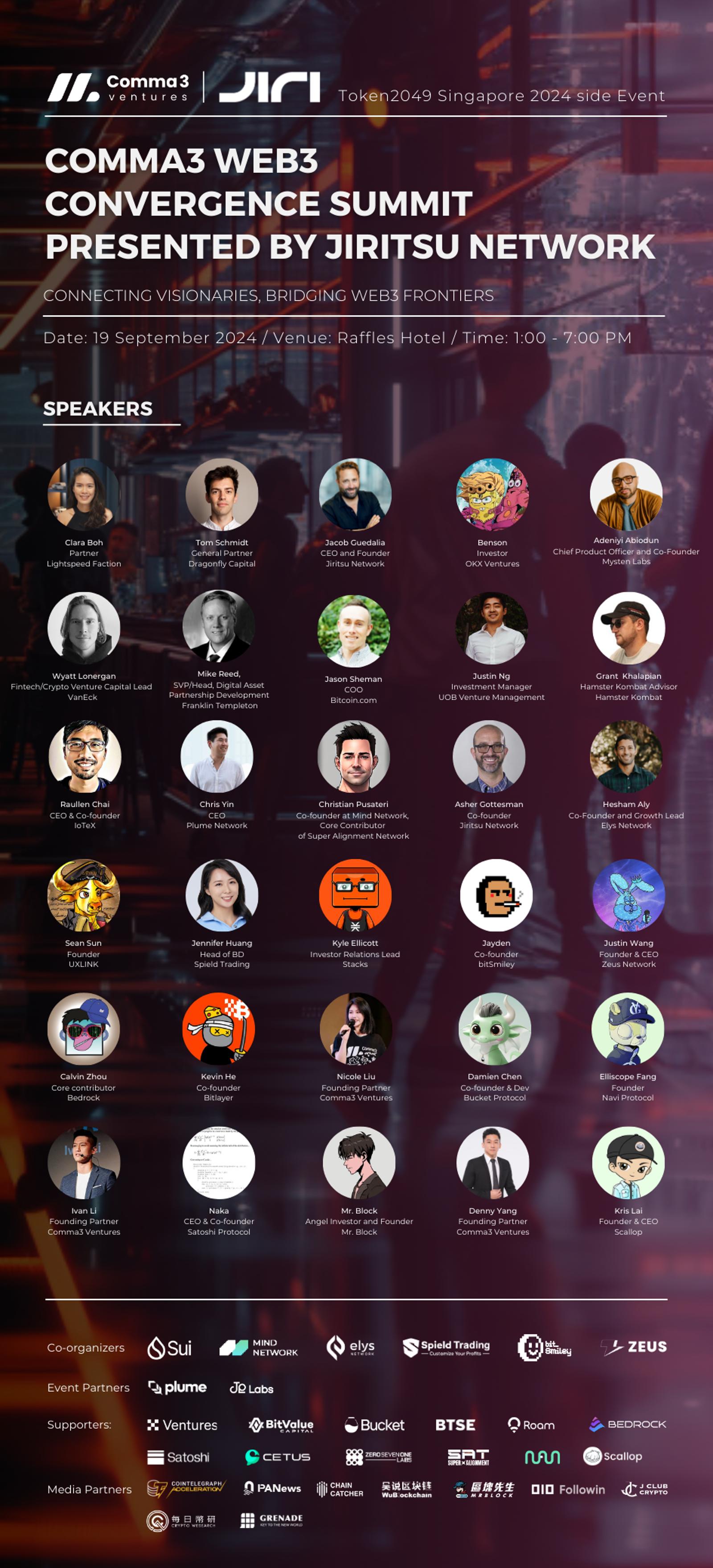 Welcome to the Comma3 Web3 Convergence Summit presented by Jiritsu Network, a cutting-edge side event of Token2049 Singapore 2024. This summit is designed to bridge visionaries, innovators, and leaders in the Web3 space, offering a unique platform to explore the future of blockchain technology and its transformative impact across industries.