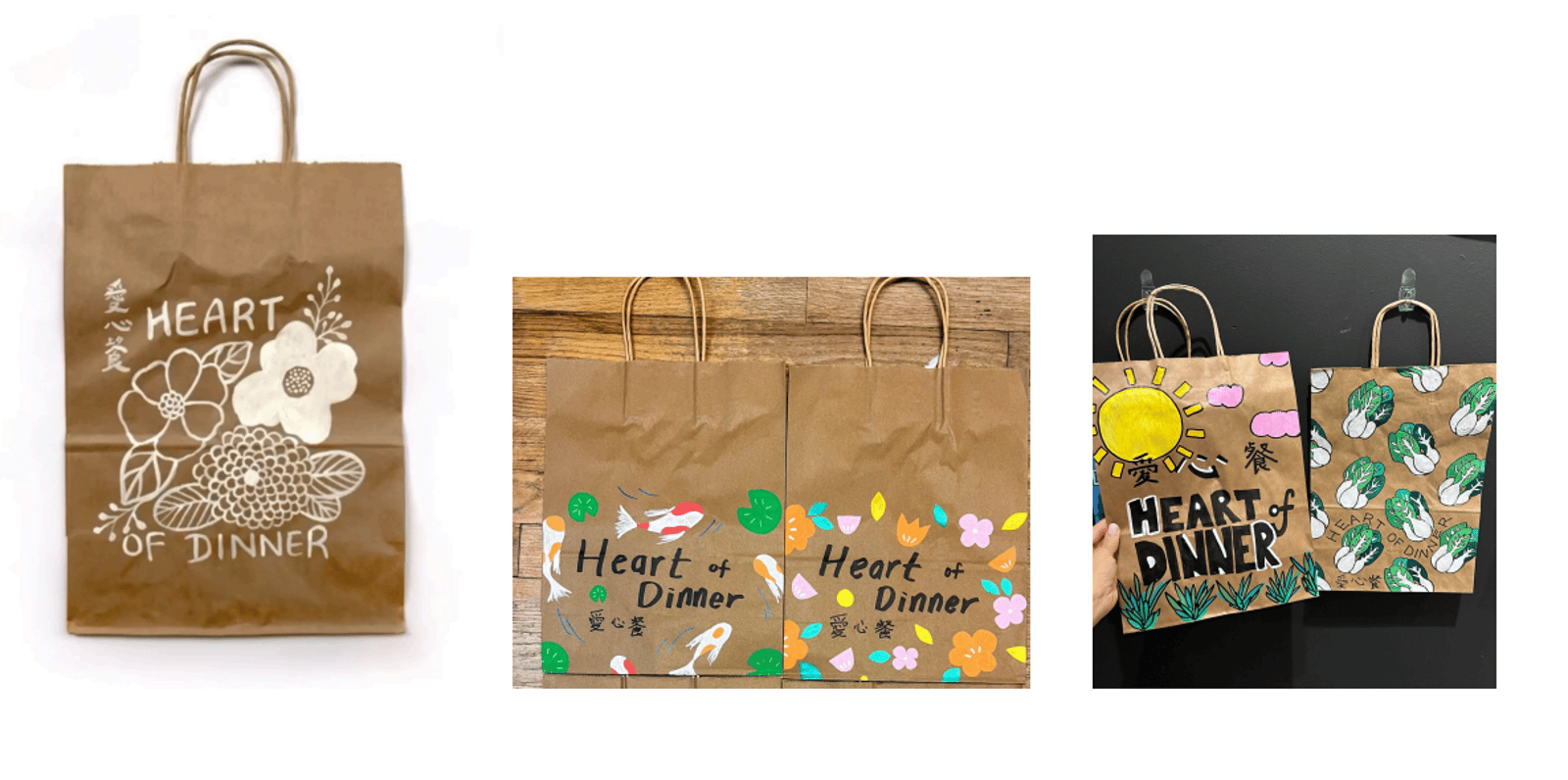 We're giving back by working with Heart of Dinner. Heart of Dinner is an organization dedicated to reducing food insecurity and loneliness among Asian American seniors living in under-resourced communities. They deliver nourishing meals prepared by local restaurants and food distributors, and they also like to include a special touch to brighten their day by packaging them in bags decorated by volunteers!