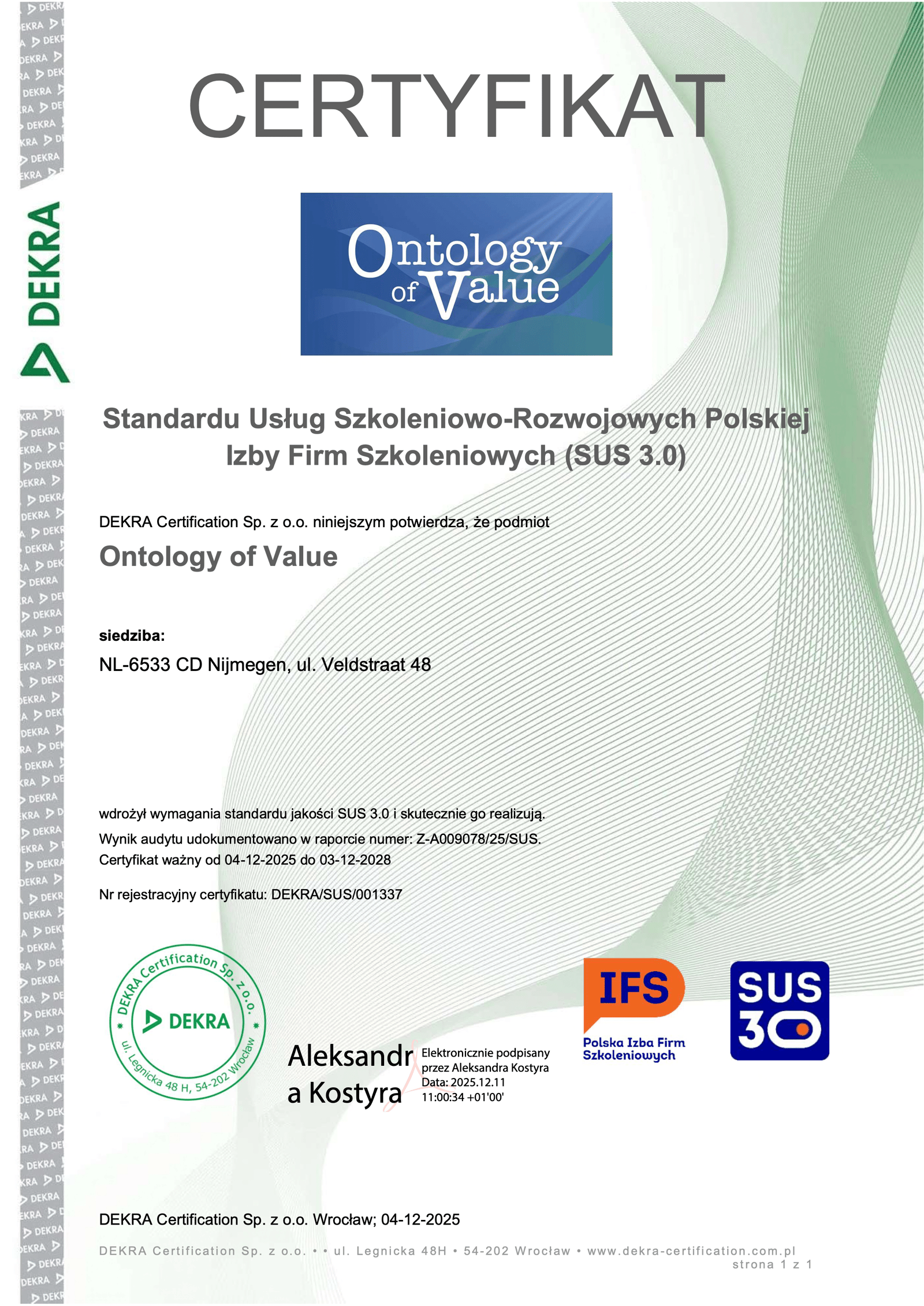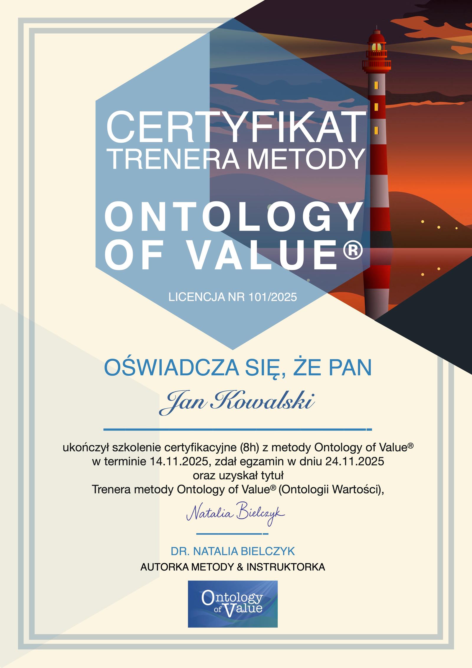 ✅ Certyfikat potwierdzający Twoje kompetencje jako eksperta Ontology of Value®