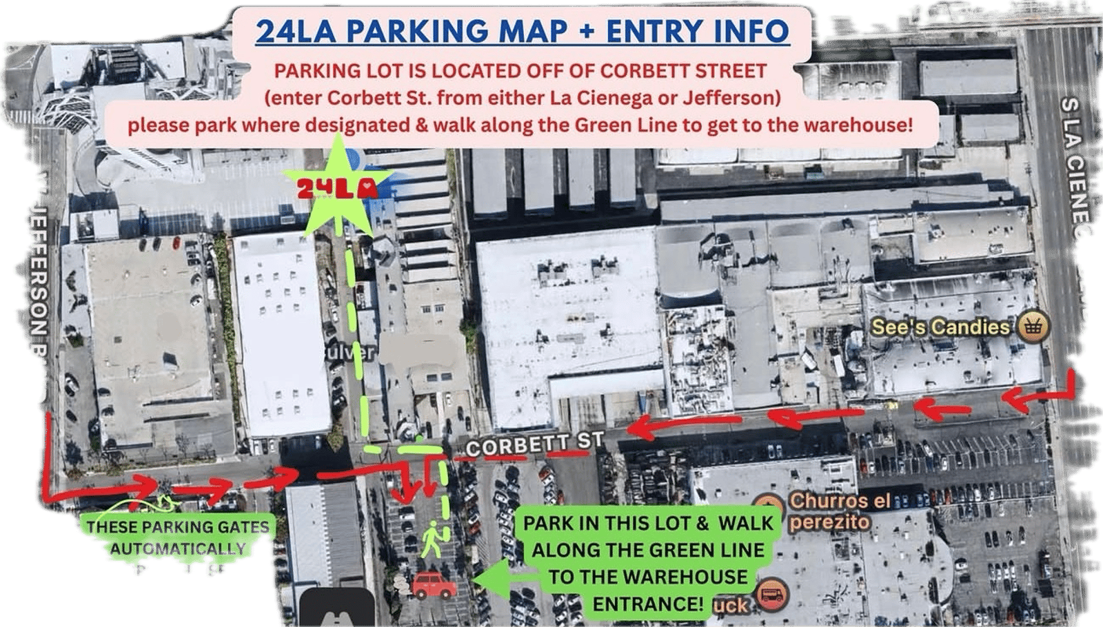 PARKING INSTRUCTIONS: Parking lot located off of Corbett St. Enter Corbett St. from La Cienega or Jefferson. Parking gates will open automatically! Park as directed on map below: