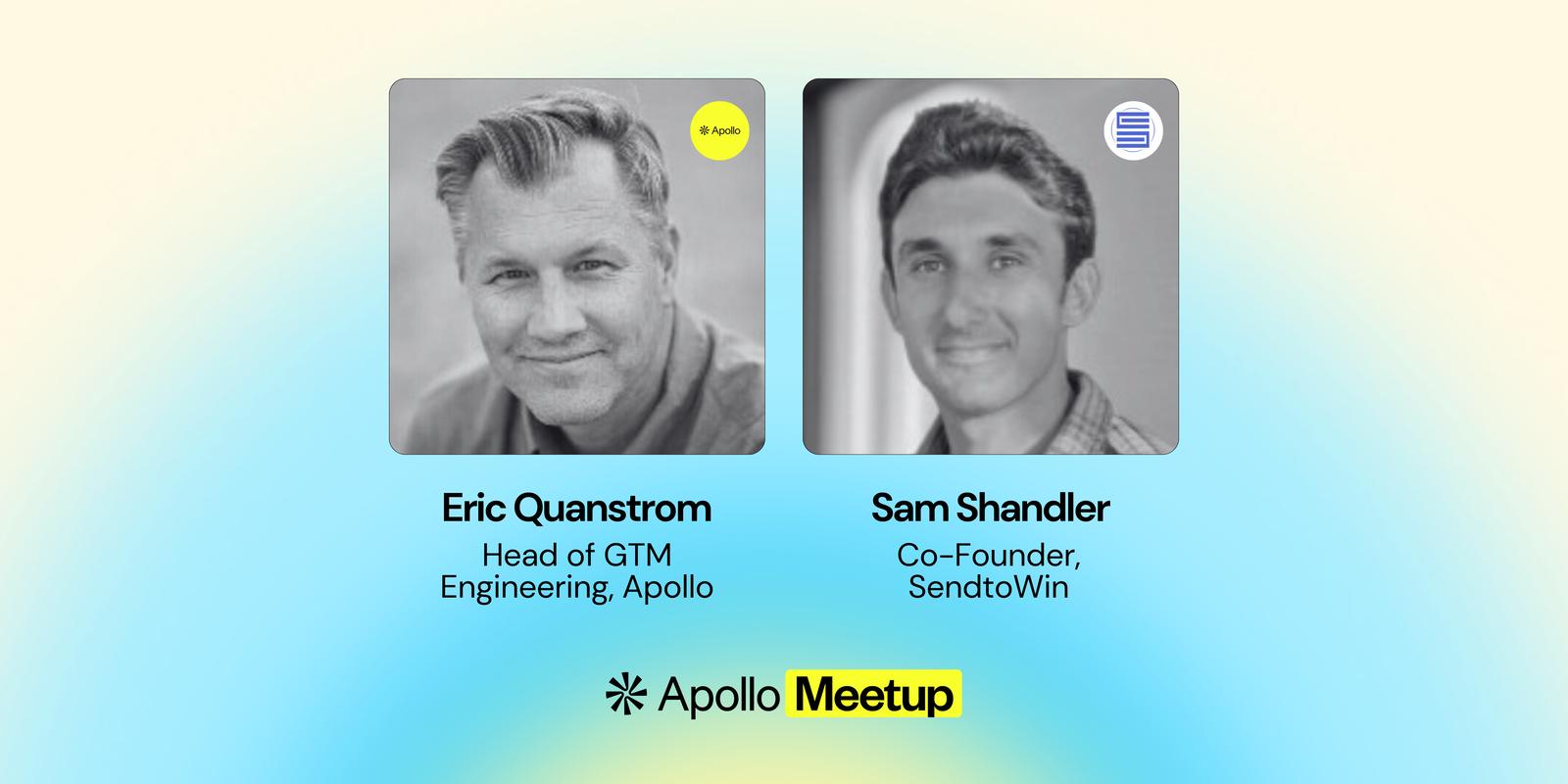6:00-6:30pm → In-depth fireside chat with Apollo VP of GTM Engineering Eric Quanstrom and SendtoWin co-founder Sam Shandler on: AI-powered GTM strategies, what's working in 2026, and where Apollo is headed next.