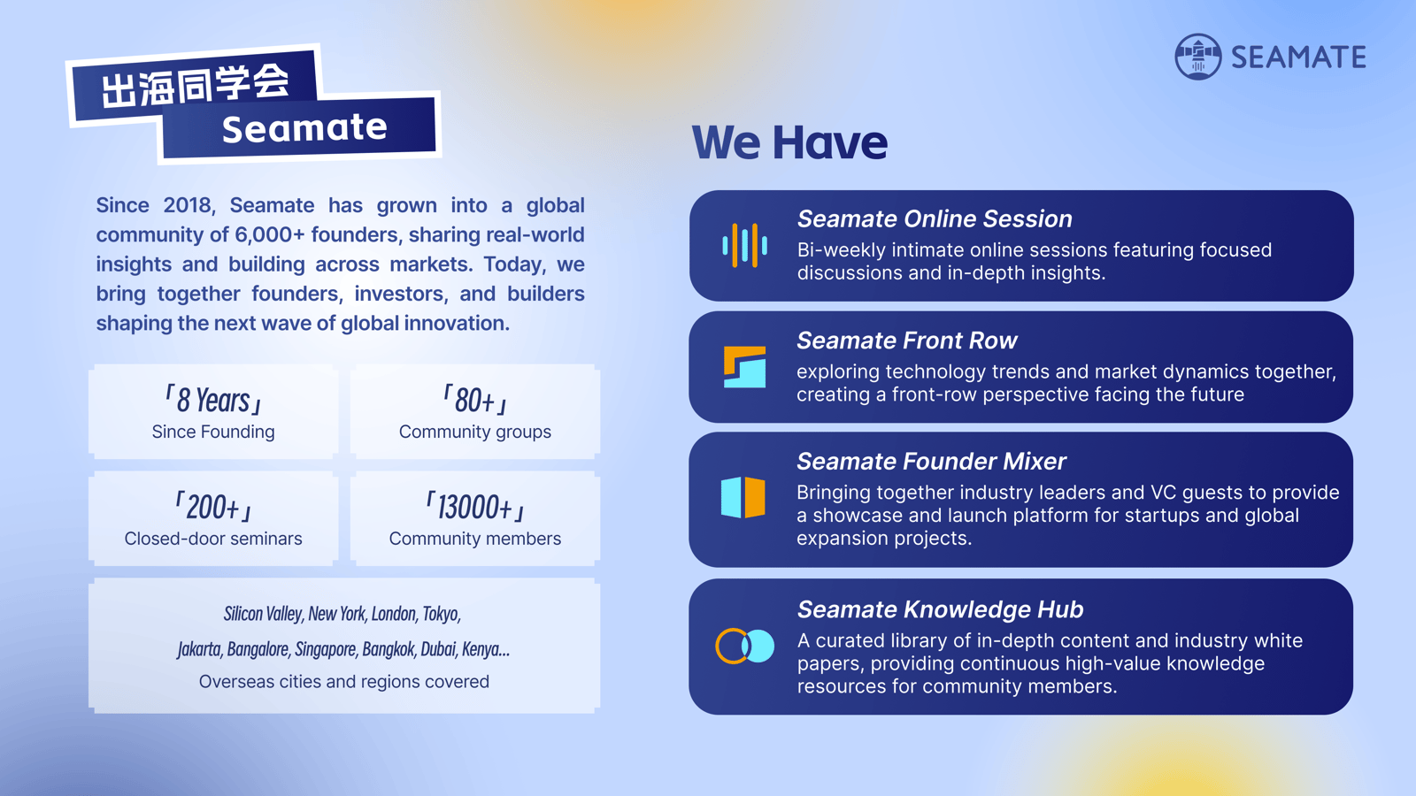 Seamate (出海同学会) is a community for founders, builders, and investors exploring AI, startups, and global markets. With 15,000+ members across 10+ countries, we connect entrepreneurs across the U.S., China, and Southeast Asia and beyond through events, conversations, and collaborations.