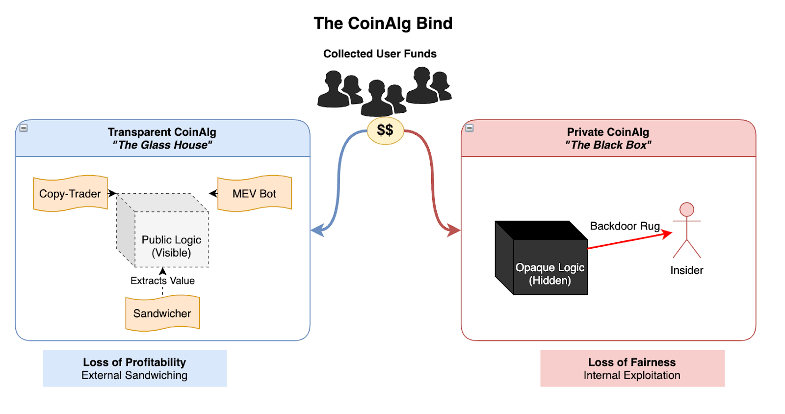 A discussion of The CoinAlg Bind, which shows a fundamental tradeoff in collective investment algorithms powering modern DeFi Trading Agents such as ElizaOS: privacy enables insider value extraction, while transparency enables arbitrage that erodes profits.