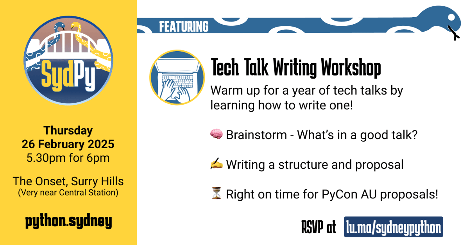 At the end of this workshop you'll have a talk title, abstract and description ready to submit to both PyCon AU 2026, and to present at Sydney Python Community later this year.