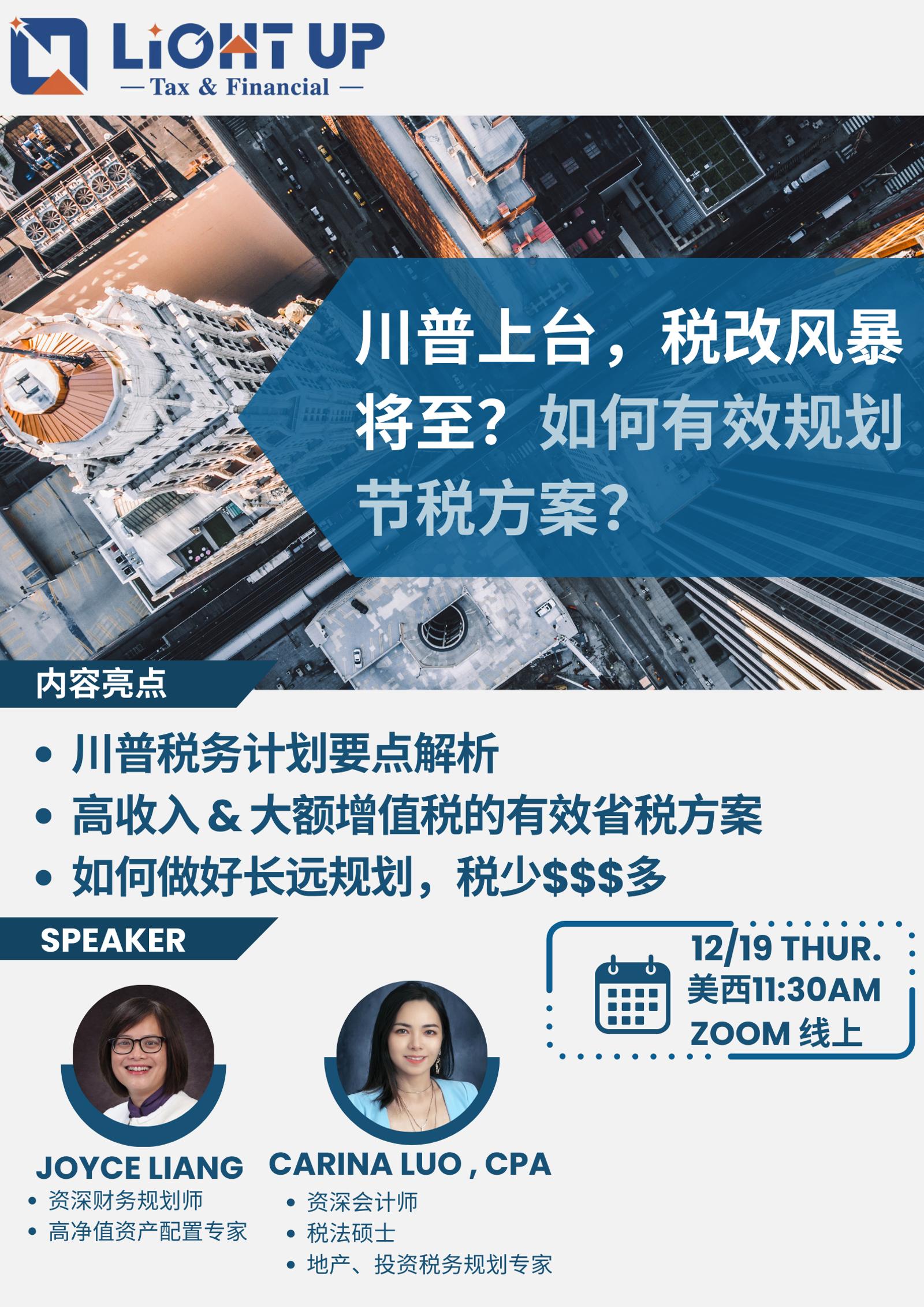 亲爱的朋友们,您是否正在关注税务改革的最新动态?想知道在可能的税改风暴中如何有效规划以节税?在即将举办的【Light up财商讲座】中,我们邀请到了资深财务税务规划师Joyce Liang与资深会计师Carina Luo, CPA,她们将为大家深度解析川普税务计划要点、高收入及大额增值税的节税策略,以及如何做好长期规划以减少税务负担。让我们共同度过一个满载干货的学习时光,期待与您相聚线上!