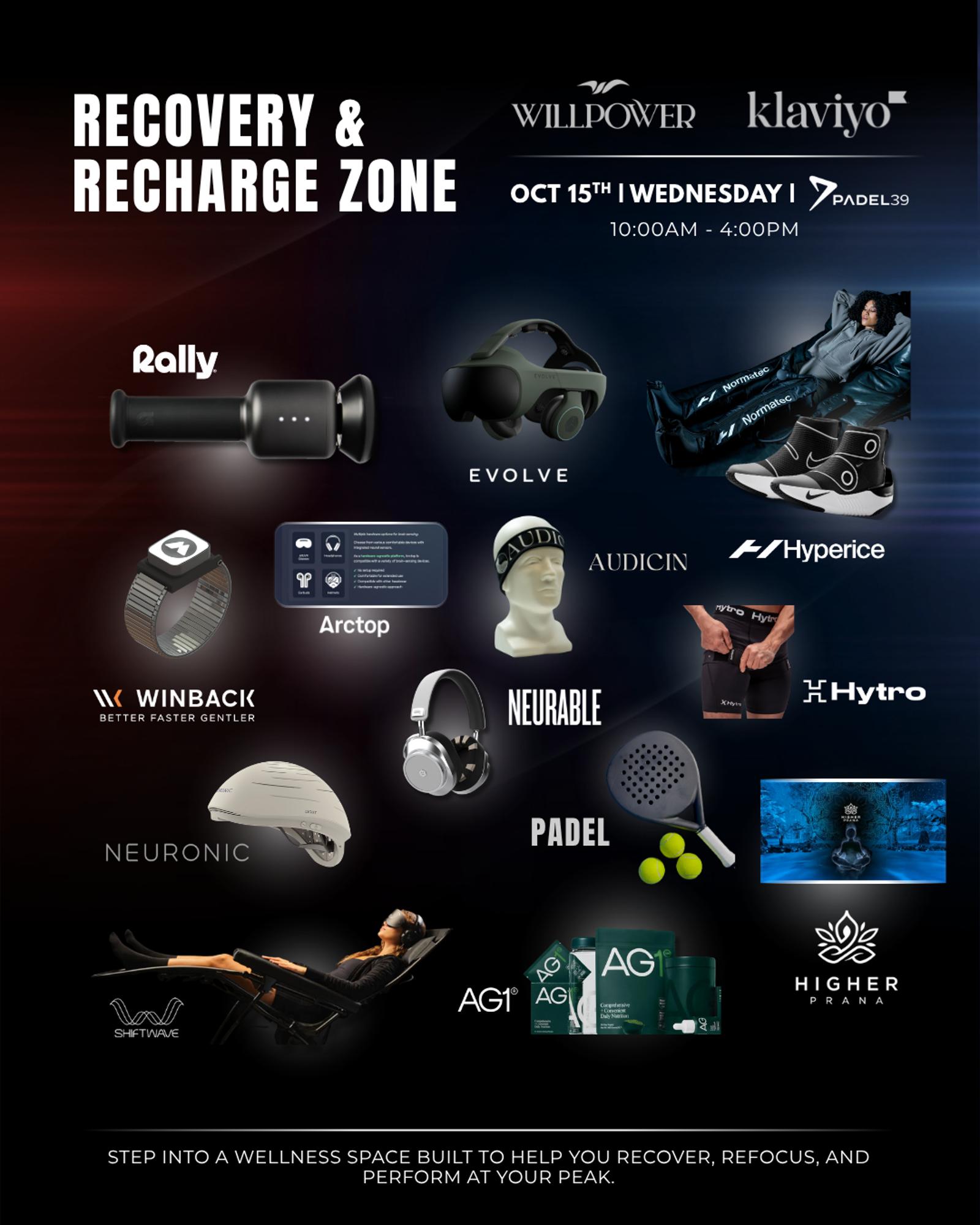 🦾 Recovery activations — Rally, Evolve, Neuronic, Shiftwave, Winback, Higher Prana VR, Hyperice, Neurable, Arctop, Audicin, and Hytro.