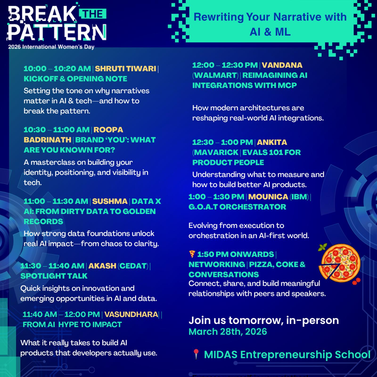 Join us for "Break The Pattern: Rewriting Your Narrative" on March 28th, an exciting celebration for International Women's Day! Dive into the dynamic world of AI and ML with an inspiring panel discussion, led by Shruti Tiwari and an ensemble of trailblazing voices in tech. This isn’t just about tech talk, but a chance to explore how we can reshape our stories and drive meaningful change in the industry.