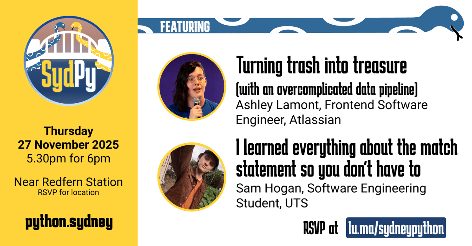 Join us for another exciting meetup in November the last SydPy of the year! We'll have two fantastic speakers to kick it off as well as some light refreshments 🍕 !
