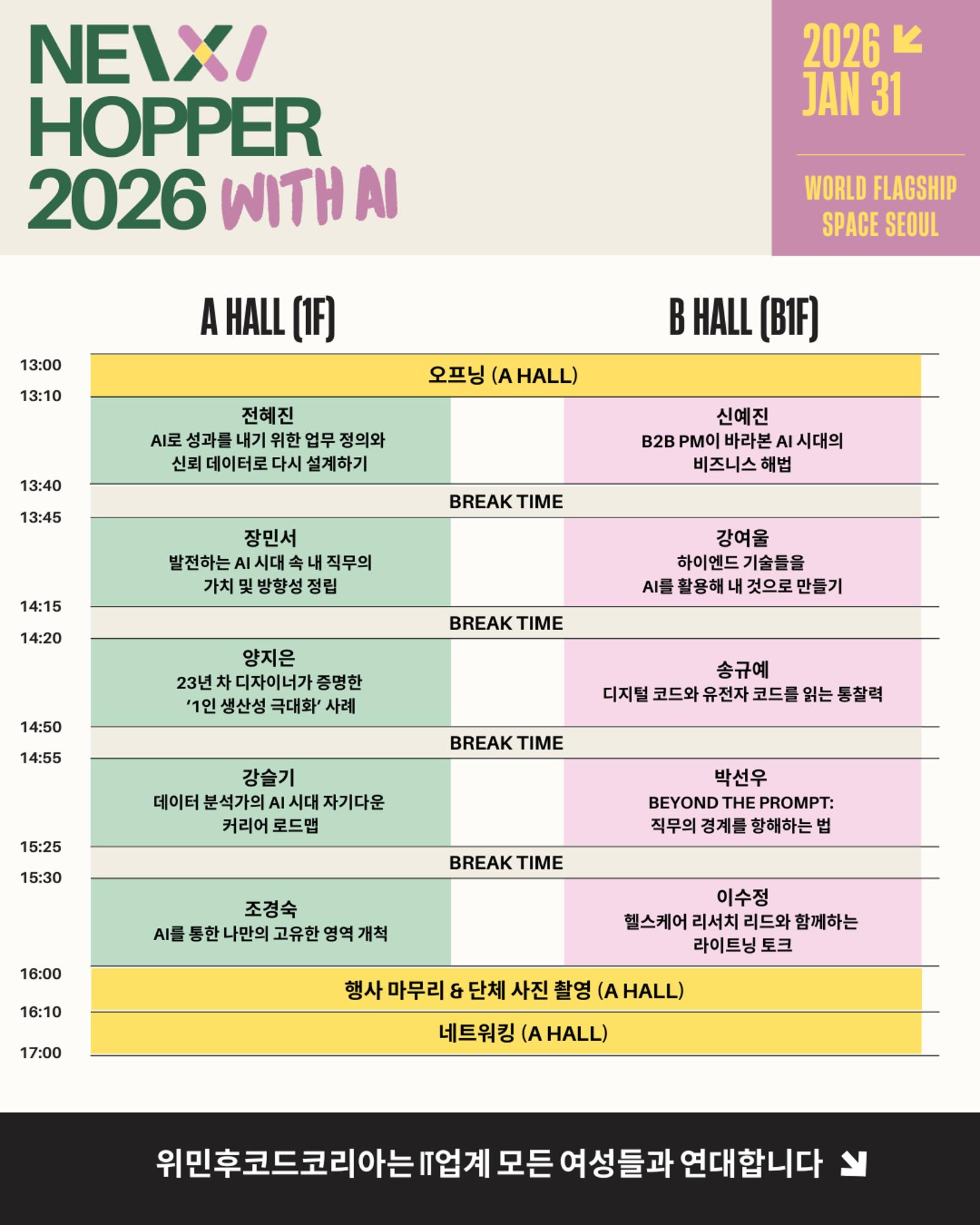 위민후코드코리아에서 AI 시대를 항해하는 IT 여성들을 위한 신년 행사, NEW HOPPER 2026을 개최합니다. 🧭
