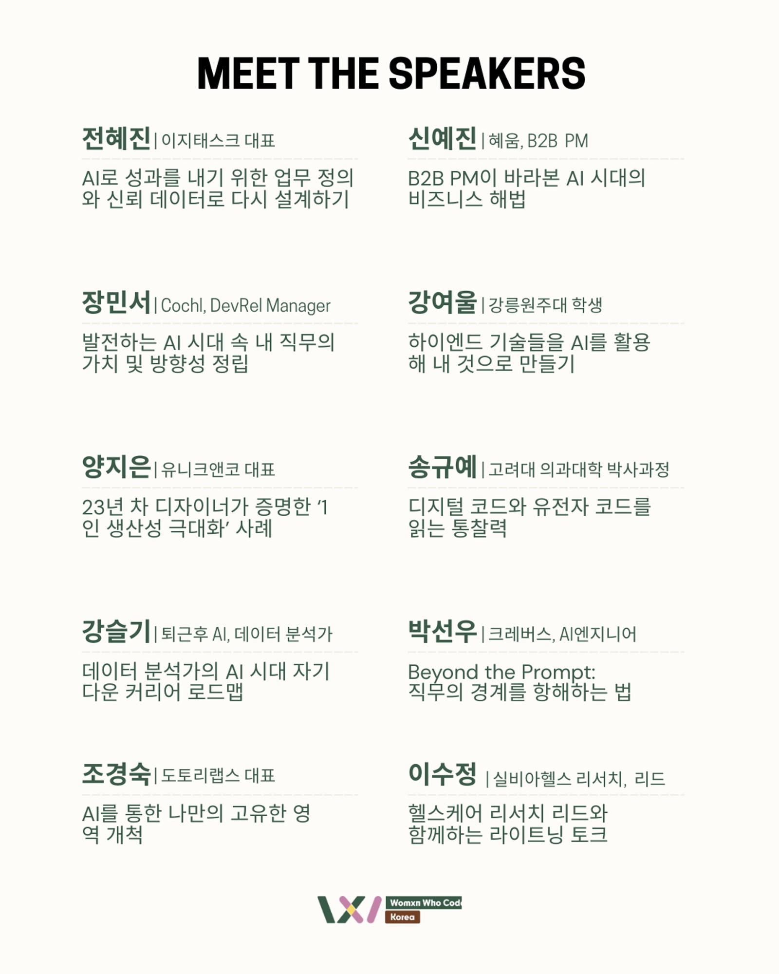 이번 행사는 급변하는 기술 환경 속에서 개발자, 기획자, 디자이너, 데이터·콘텐츠·공익 분야 등 다양한 직군의 여성들이 모여 테크 세션과 커리어·생산성 세션을 통해 인사이트를 나누고, 서로의 선택과 성장을 응원하며 연결되는 자리입니다.