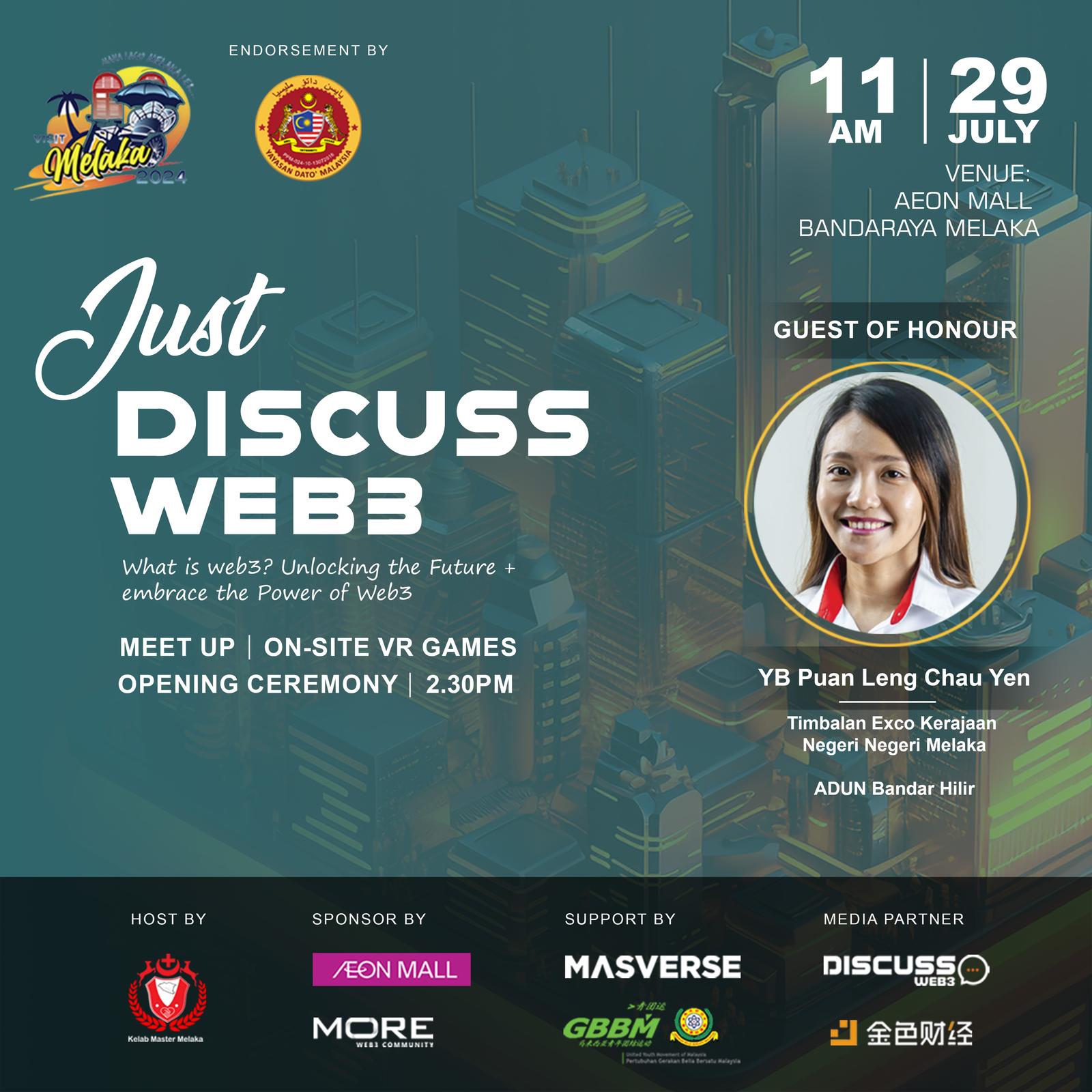 โ๐ Organized by Kelab Master Melaka, sponsored by More Community, and co-organized by Discussweb3, the grand public event "Just Discuss Web3" will take place at the AEON Mall Bandaraya Melaka atrium.๐๐