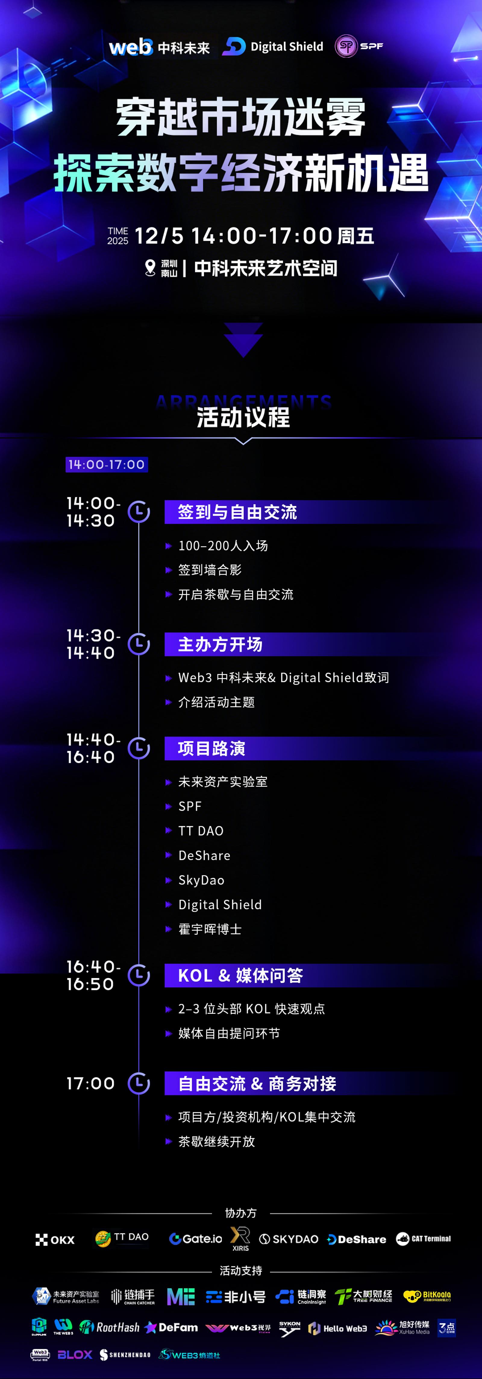 本次线下高端沙龙由 WeWeb3 中科未来联合 Digital Shield 与SPF主办,以 「穿越市场迷雾・探索加密新机遇」 为主题,将汇聚 100–200 位来自交易平台、生态项目、投资机构及技术团队的核心从业者。活动将通过深度分享、专业路演与高效交流,共同探讨下一阶段 Web3 的增长动力与潜在机会。