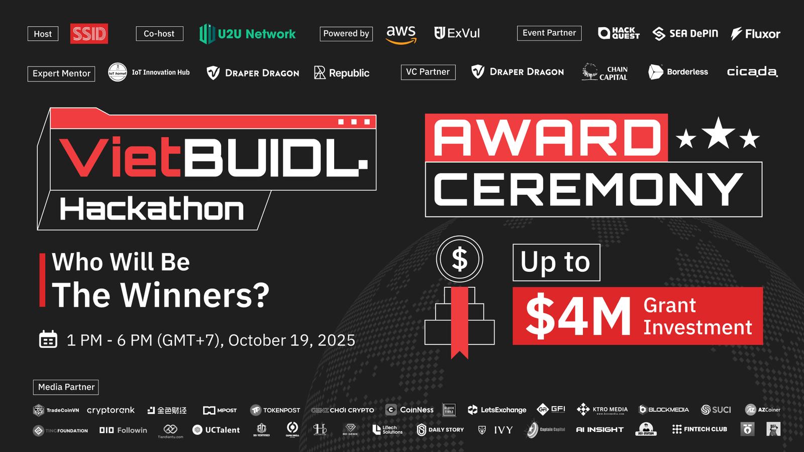 Lễ Trao Giải VietBUIDL Hackathon 2025 đánh dấu chặng cuối của hackathon lớn nhất Đông Nam Á, được đồng tổ chức bởi SSID (SSI Digital) và U2U Network. Nhiều tuần lễ miệt mài xây dựng, thử nghiệm và những đêm thức trắng – tất cả đều đang mong chờ khoảnh khắc này.