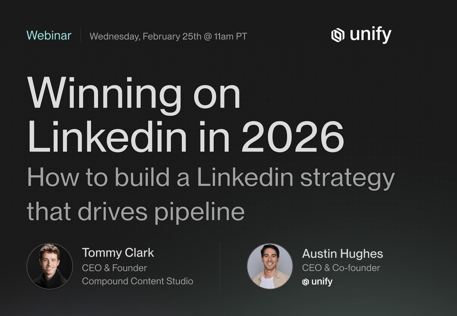 In this webinar, Tommy Clark, CEO and Founder of Compound Content Studio, and Austin Hughes, Co-Founder and CEO of Unify, break down what’s actually working on LinkedIn in 2026. From building an authentic founder voice to turning consistent content into real business outcomes, they’ll share their POVs, lessons learned, and real examples from the front lines.