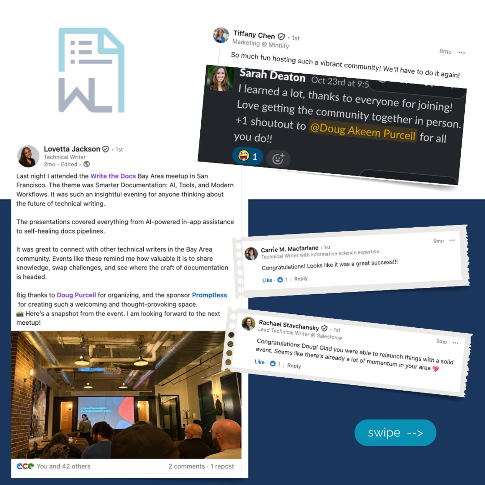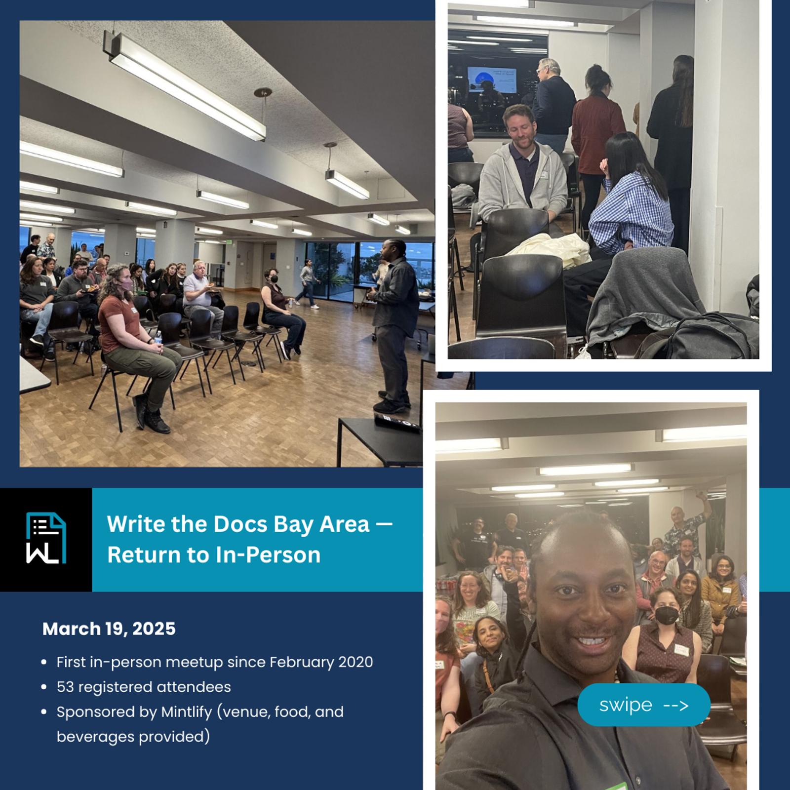 Write the Docs Bay Area invites you to an evening exploring the evolving world of developer experience. Documentation teams are rethinking the platforms they use and how they work as AI reshapes workflows. Join technical writers, engineers, and product leaders for talks on modern documentation platforms and using AI to offload repetitive tasks so teams can focus on high-value work. At our last event, attendees called the panels “excellent,” praised the “candid discussions,” and 91% made meaningful professional connections.