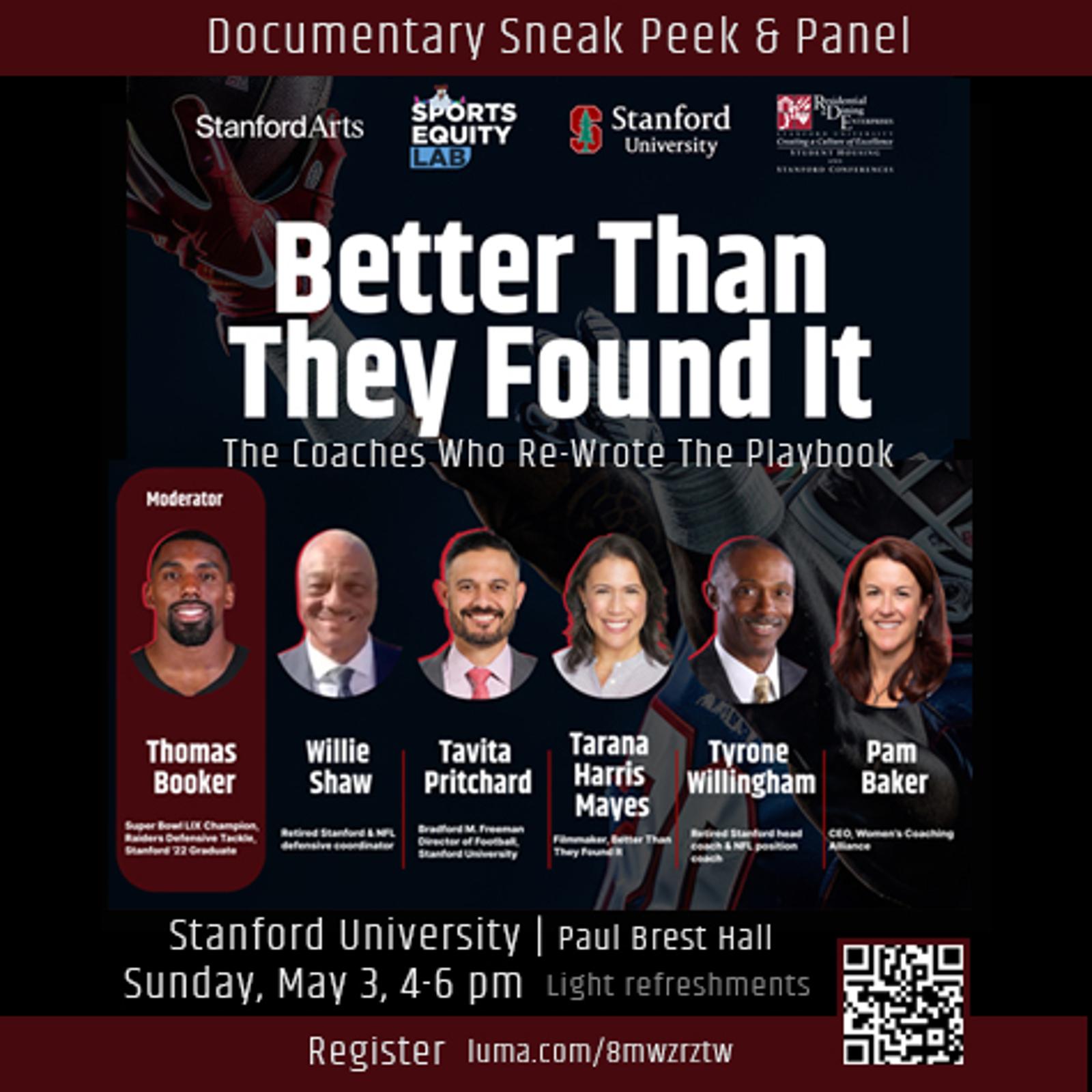 “Better Than They Found It” is a documentary clips and conversation event hosted by Stanford University’s Sports Equity Lab to celebrate the legacy of coaches who shaped Stanford and the NFL. The experience, driven by data, pairs powerful storytelling with a dynamic panel of distinguished speakers.
