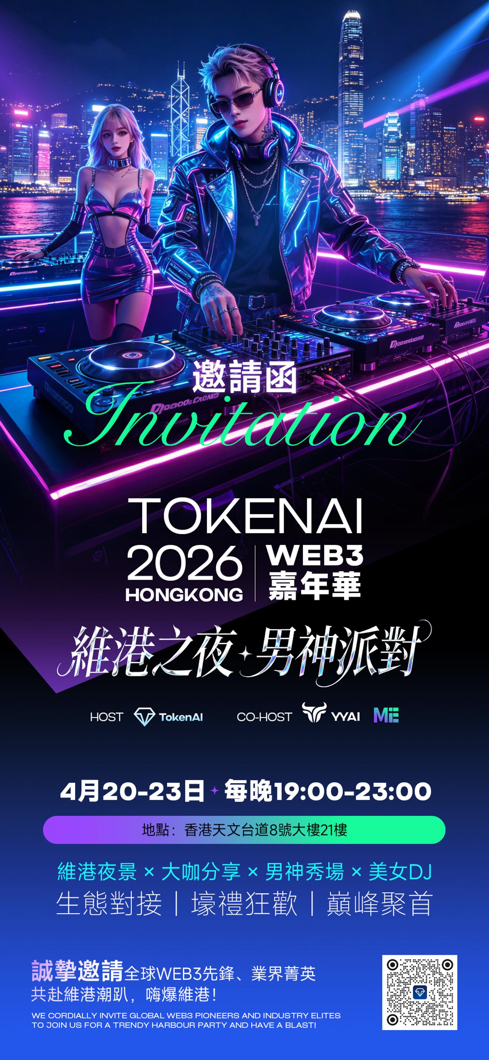 當維港霓虹遇見 WEB3 狂潮,一場顛覆想象的頂級派對即將開啟! 當維多利亞港的璀璨燈光鋪滿天際線,當 WEB3 的前沿思潮碰撞潮流娛樂,TOKENAI 2026 香港 WEB3 嘉年華重磅呈現「維港之夜・男神派對」,由 TokenAI 主辦、YYAI 與 ME 聯合主辦,誠邀全球 WEB3 先鋒、業界菁英共赴一場集頂級視聽、生態對接、壕禮狂歡於一體的巔峰盛會!