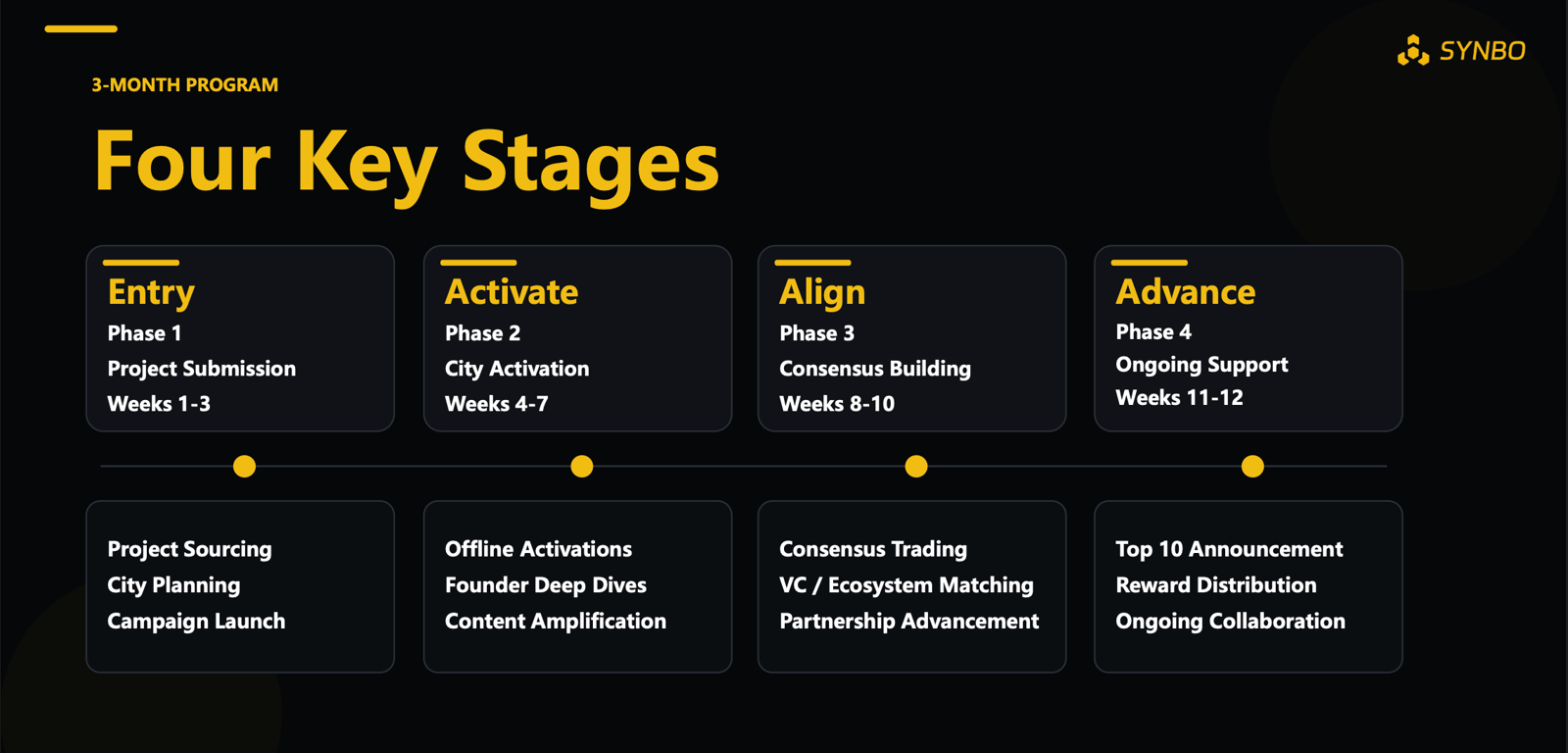 💡 这是一个为期3个月的增长机制,围绕线下城市活动、线上内容与平台共识交易,帮助项目完成关系链接、资源拓展、品牌增长与商业转化。