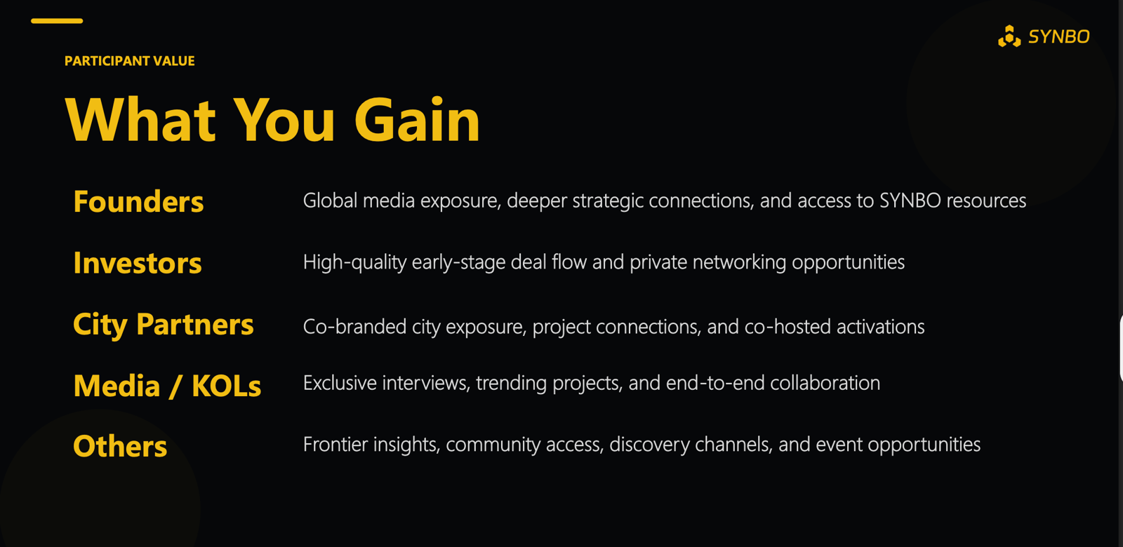 👨💻 For Founders: Gain global media exposure, secure deeper strategic connections, and tap directly into SYNBO's resources. 🤝