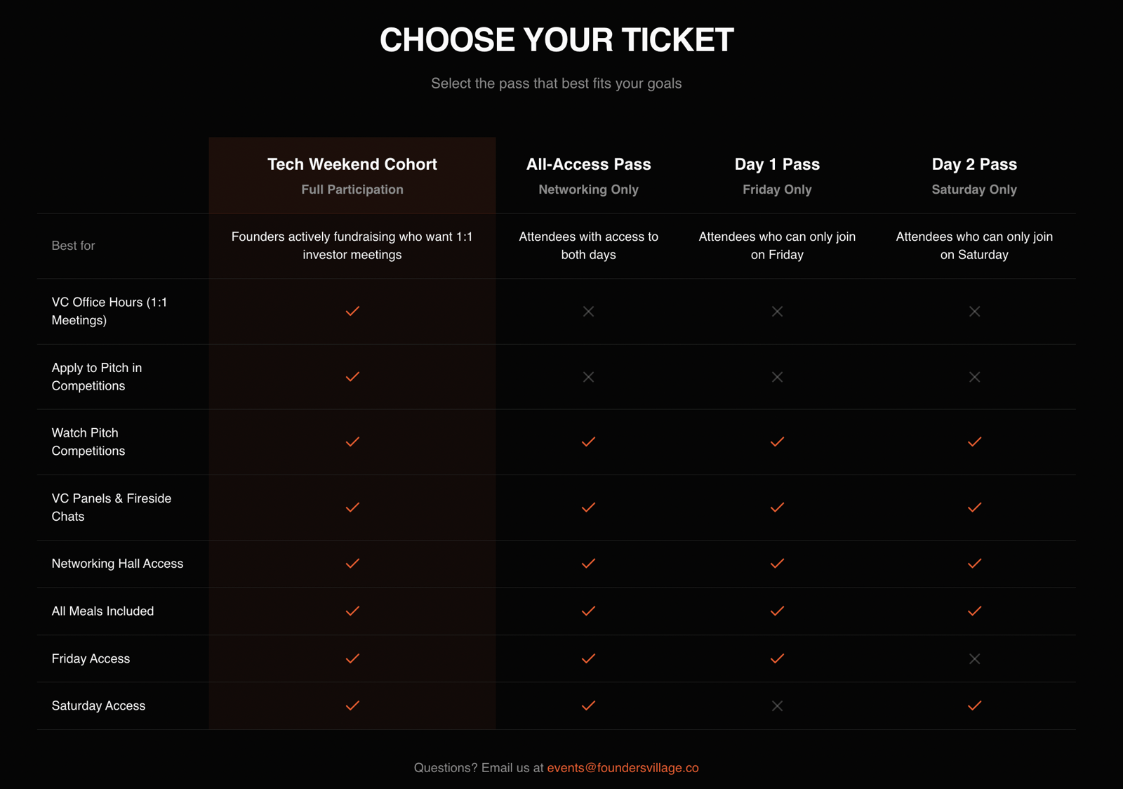 What is Tech Weekend? A 48-hour fundraising sprint by Founders Village where pre-seed to Series A founders meet dozens of investors in back-to-back sessions.