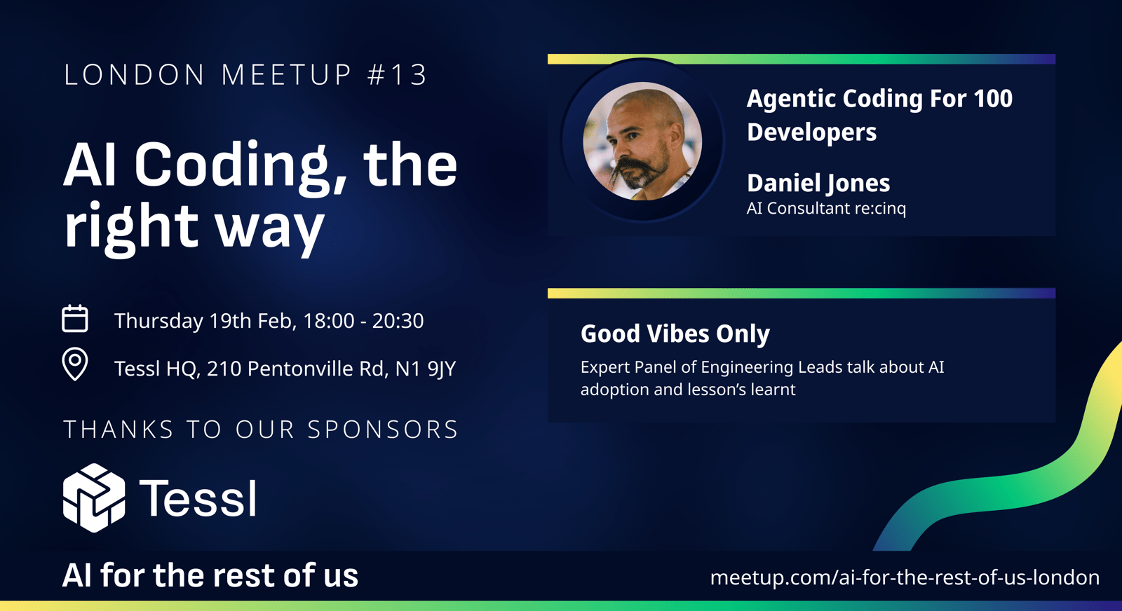 Our theme for this meetup is AI Coding the right way. We'll be joined by Daniel Jones (AI Consultant, re:cinq) who has taught over 100 developers how to get the most of AI tools. Then we welcome a panel of engineering leaders to discuss the lessons they have learned on getting the best from their teams with new tools!