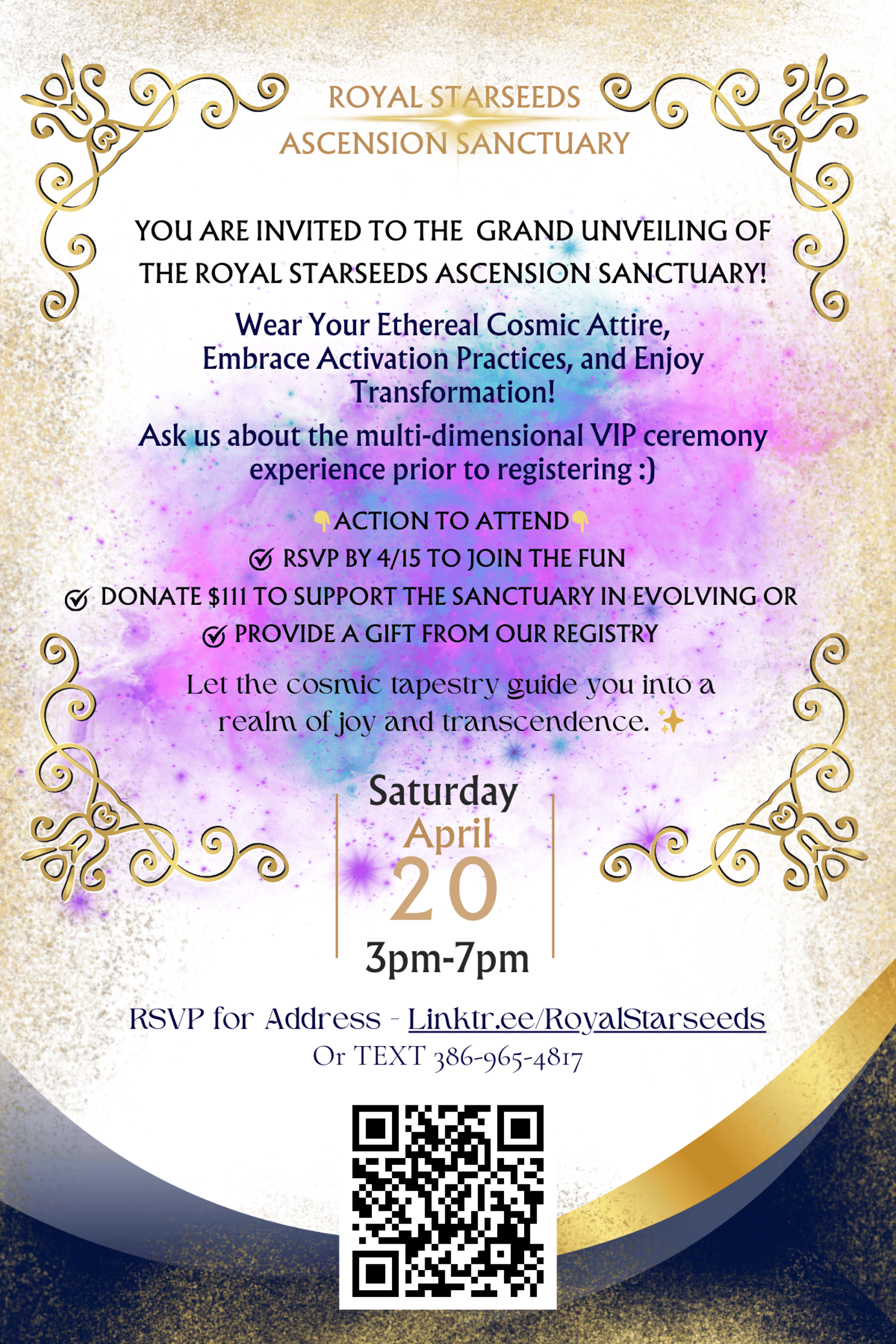 You are cordially invited to the inaugural awakening of our sacred space, the Royal Starseeds Ascension Sanctuary, on Saturday April 20th from 3:00 PM to 7:00 PM.